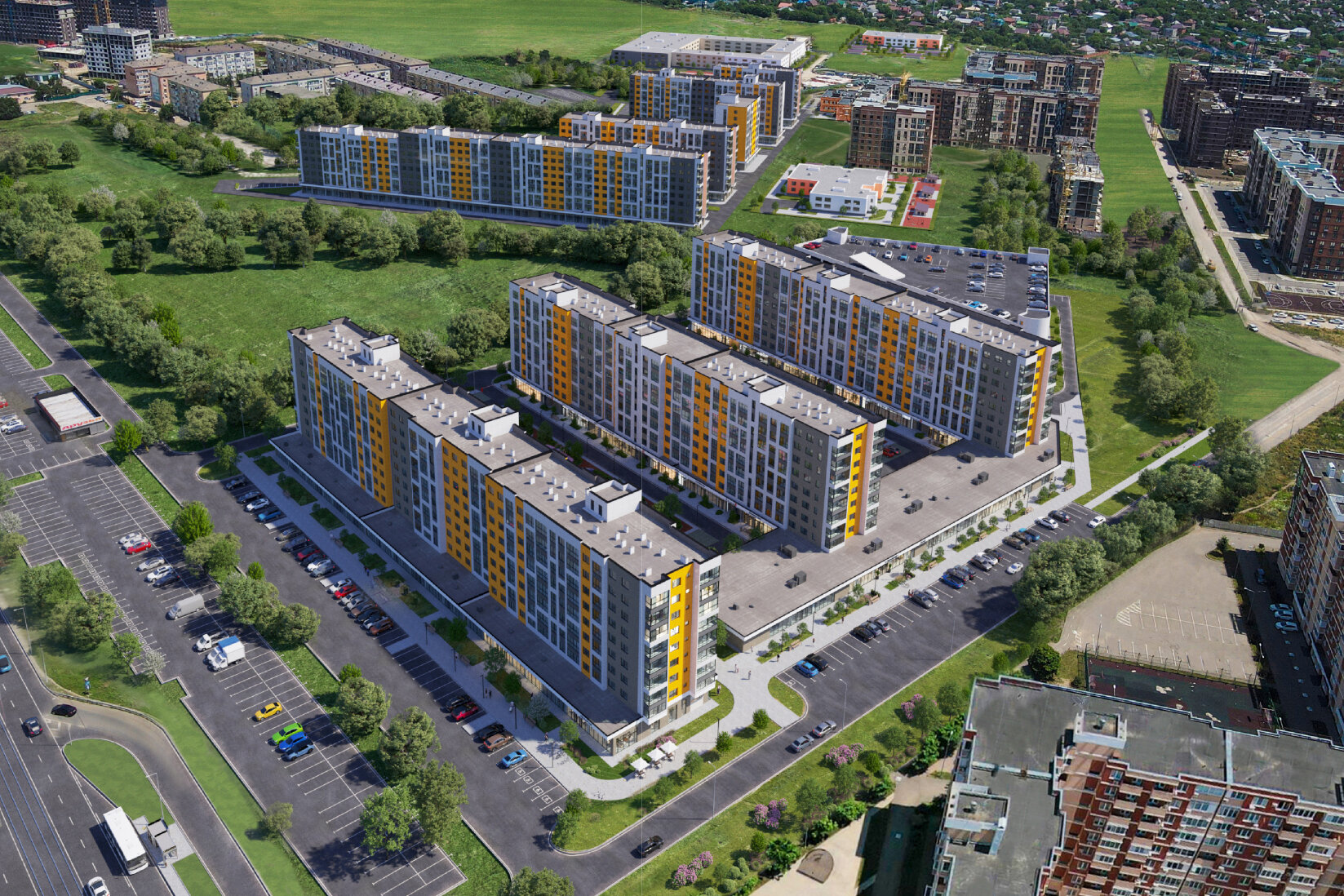 Паркинг. На территории ЖК запланирован подземный многоуровневый паркинг на 1440 мест. По периметру ЖК будут находиться открытые стоянки.