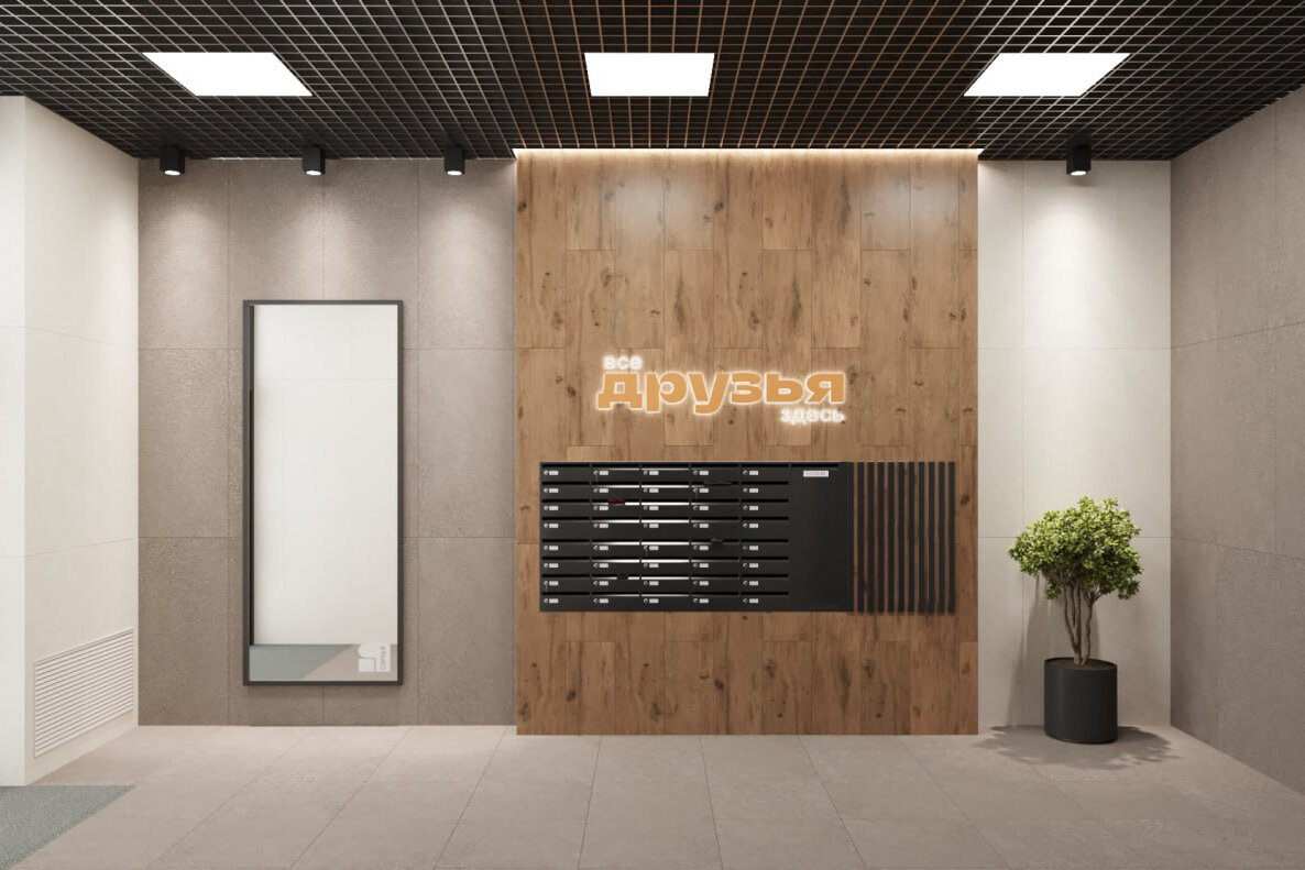 Входные группы. Вход в здание расположен на уровне земли для удобства перемещения с колясками, велосипедами и т.д. В холлах планируется установка почтовых ячеек, а также крепежей для хранения велосипедов и самокатов.
