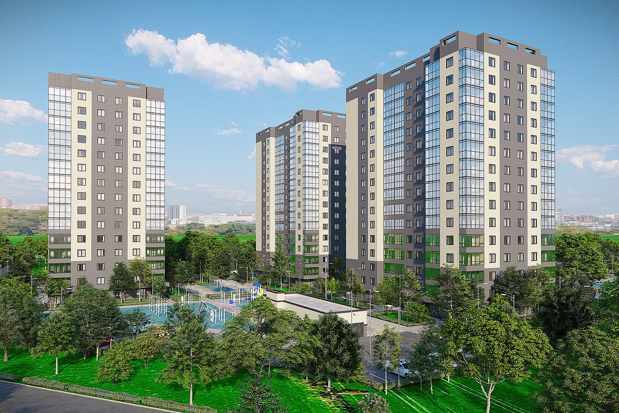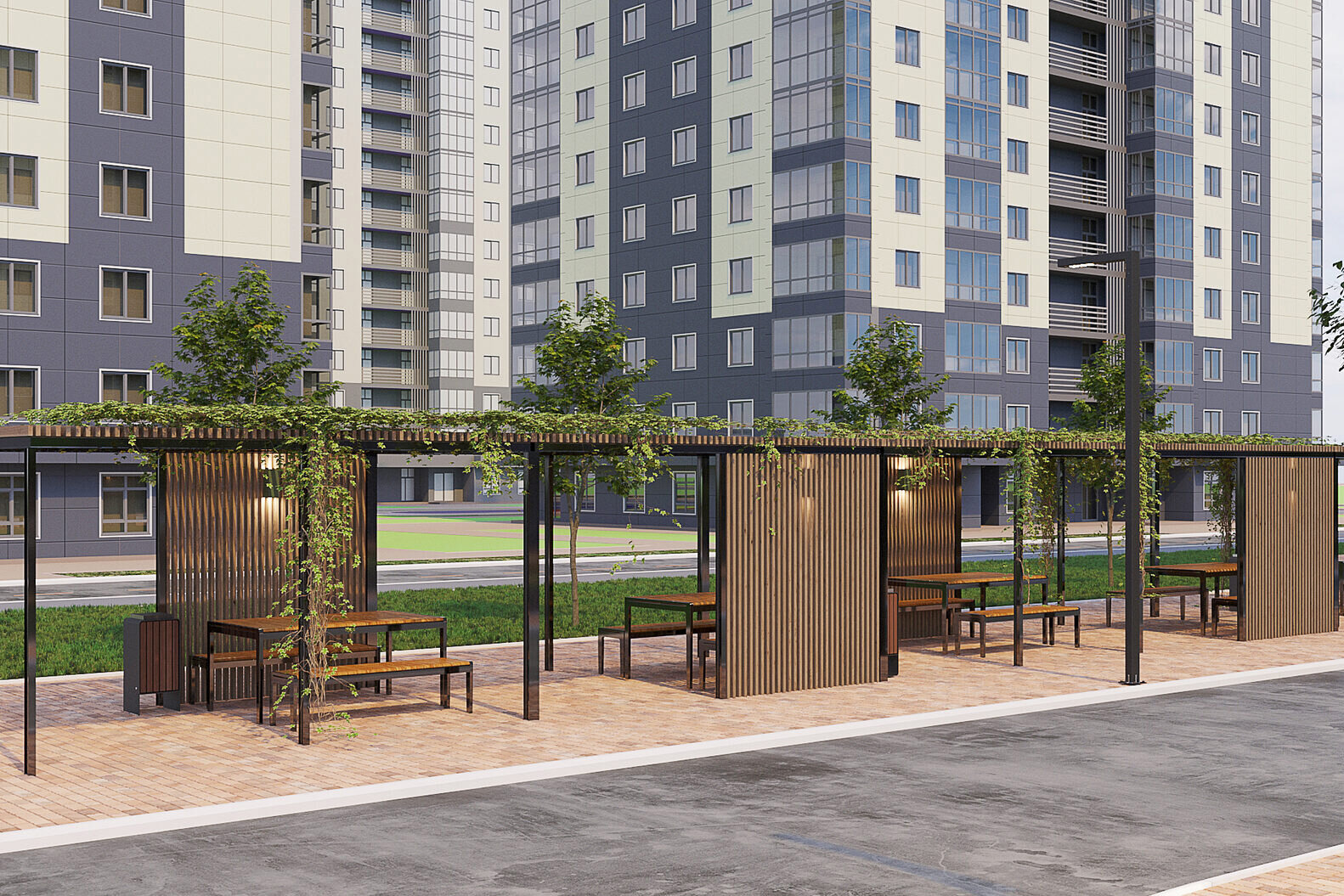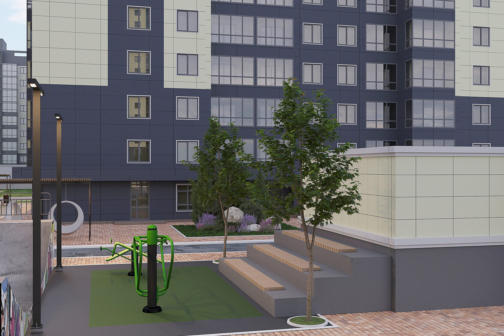 Дворы. Дворы будут благоустроены и закрыты от посторонних. Территорию разделят на тематические зоны: для детей построят площадки с безопасным покрытием, а для взрослых — зоны для игровых видов спорта. Во дворах также установят площадки для барбекю.