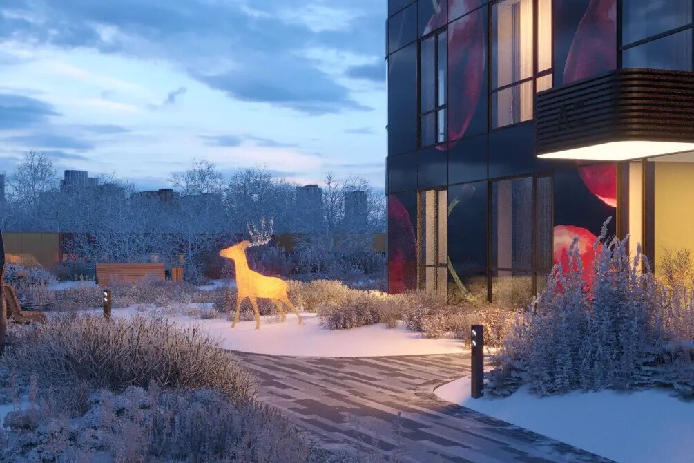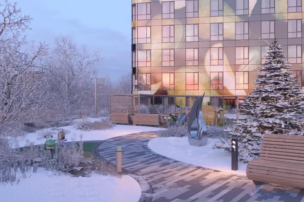 Дворы. При ЖК будет закрытый благоустроенный двор с ландшафтным озеленением, детскими площадками и тренажёрами, шезлонгами и прогулочными дорожками. Попасть на территорию комплекса смогут только жители.