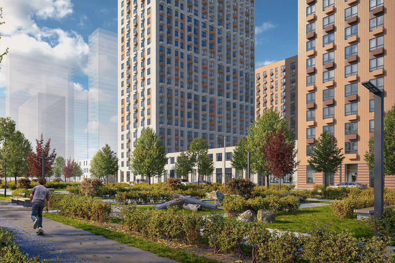 На территории квартала застройщик запланировал широкий пешеходный бульвар, где жители смогут гулять и заниматься спортом. На бульваре разместятся игровые зоны для детей и места для отдыха.