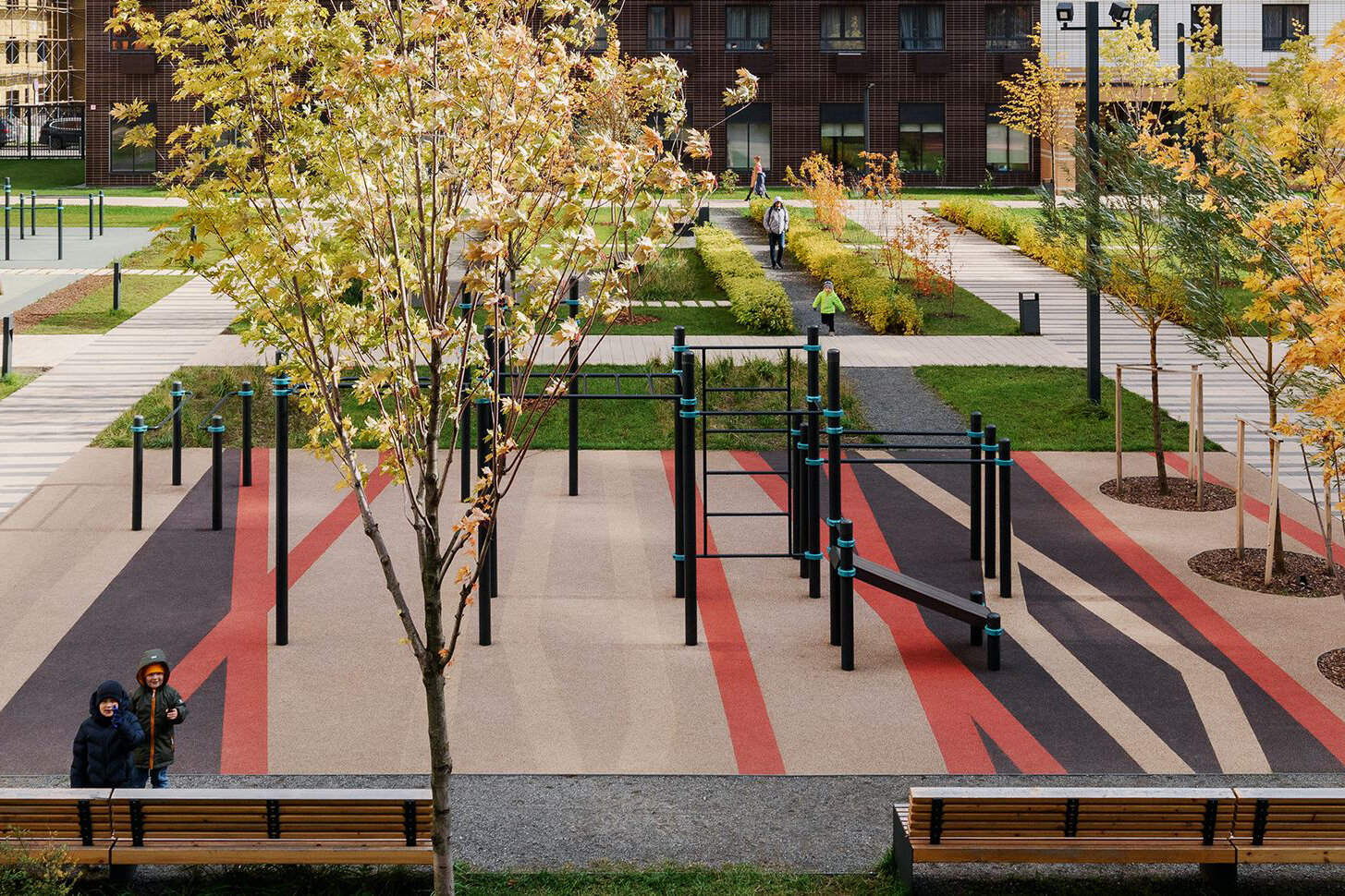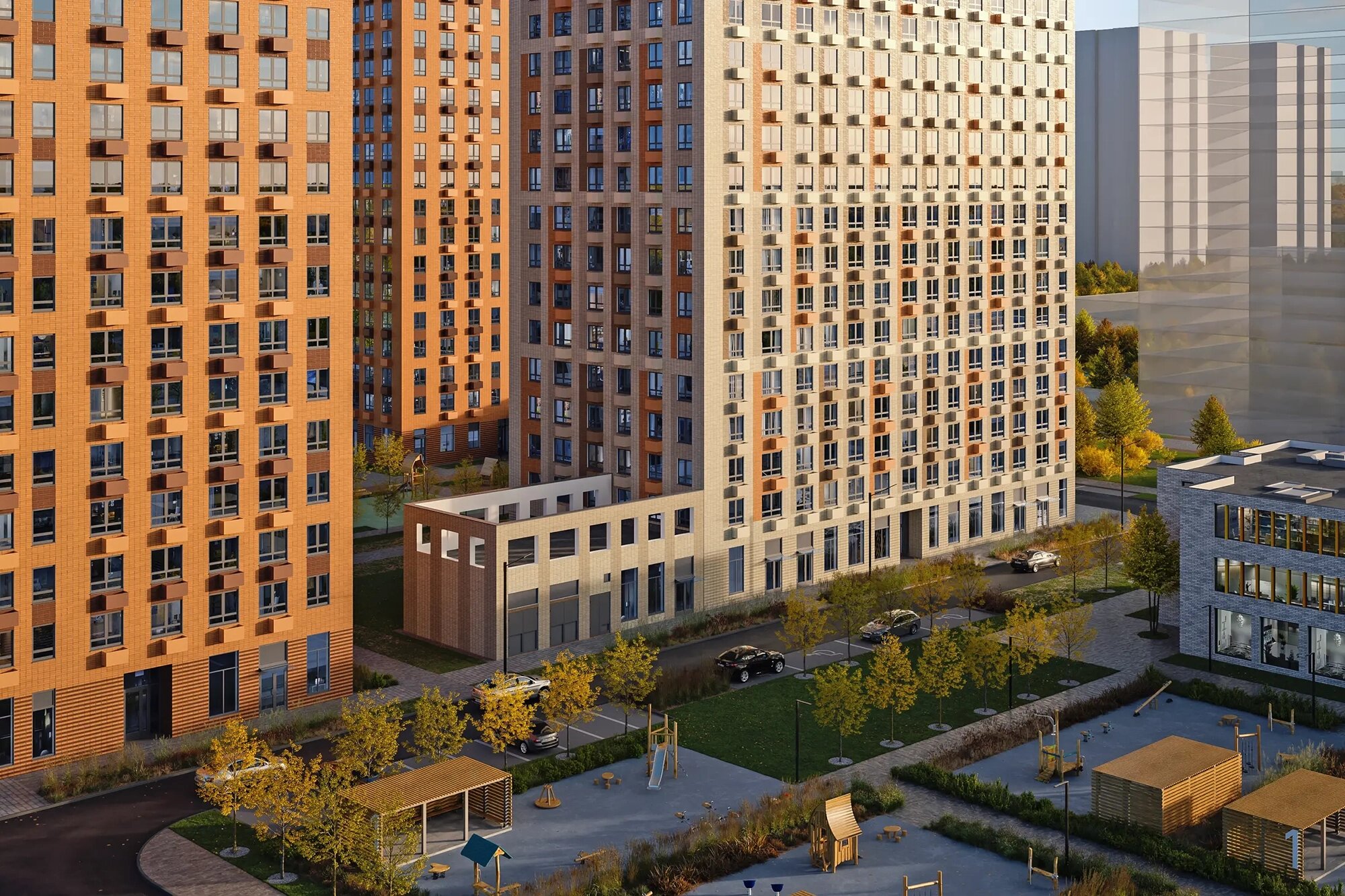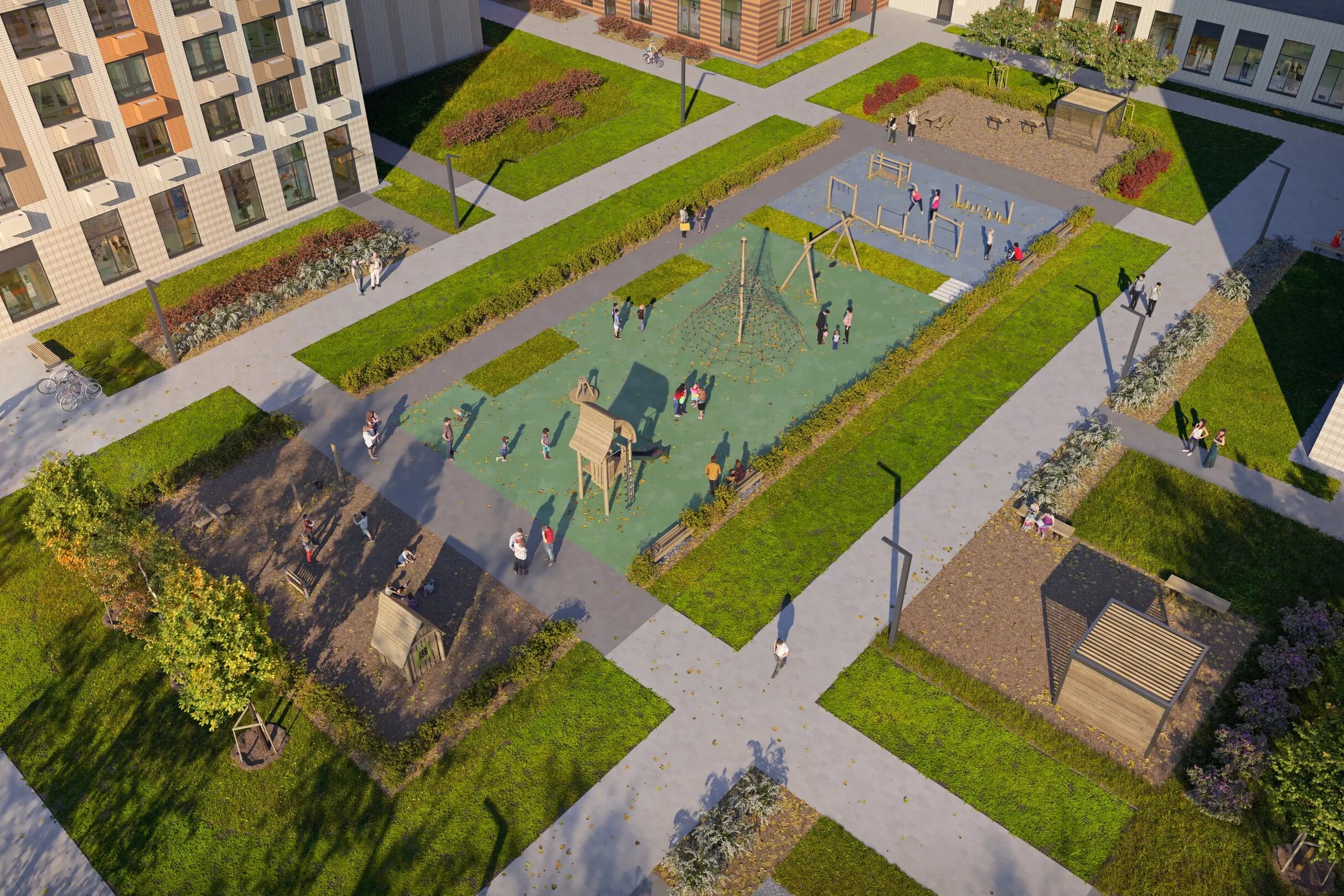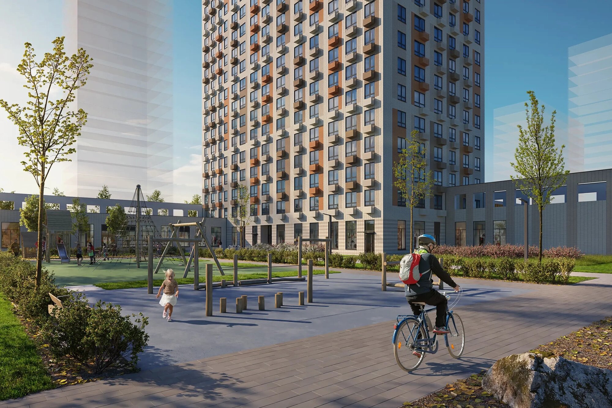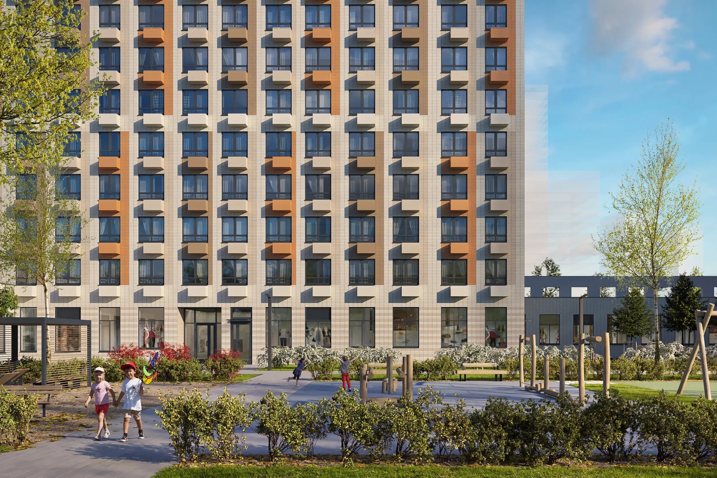 Для детей. Во внутренних дворах комплекса оборудуют детские площадки с качелями, песочницами, горками, игровыми и спортивными конструкциями. Всё наполнение площадок будет изготовлено из натуральных материалов. На территории ЖК построят школу на 550 учеников и три детских сада: два по 150 мест и один на 225 мест.