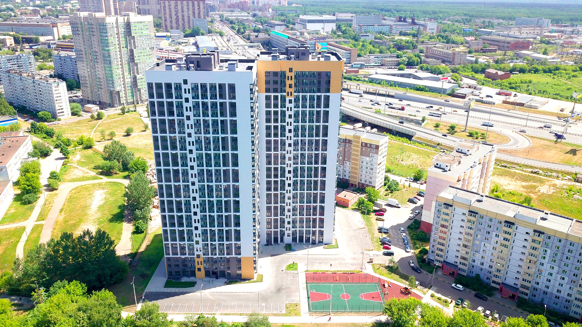 Двор. На территории жилого комплекса расположены спортивные площадки, зоны с уличными тренажёрами, футбольное поле, детские игровые площадки с безопасным покрытием. Спроектированы аллеи для прогулок и зоны отдыха со скамейками.