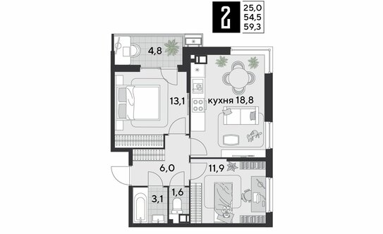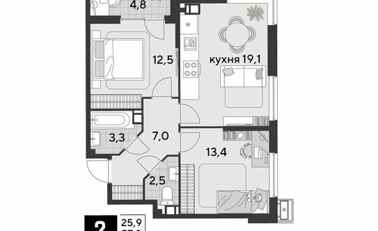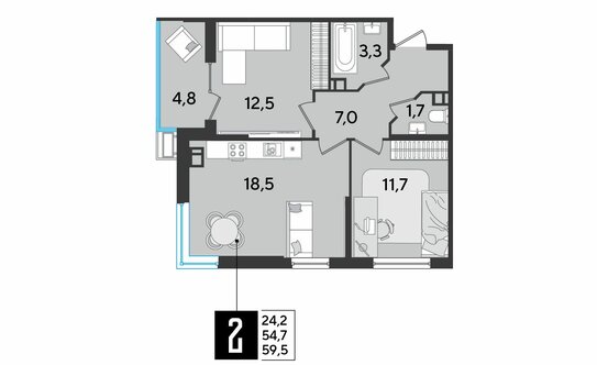 Двухкомнатные квартиры в ЖК есть разные: с окнами на одну сторону света, угловые, а также «распашные» с окнами на две противоположные стороны. Во всех «двушках» предусмотрены лоджии, в большинстве вариантов спроектированы раздельные или дополнительные санузлы. Можно подобрать квартиру с кладовой, есть планировки с кухней-гостиной.