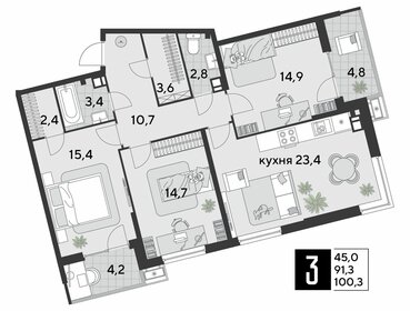 В трёхкомнатных квартирах — раздельные санузлы, есть лоджия, окна выходят на две стороны света. Есть варианты с комнатами неправильной формы: для кого-то это может быть плюсом, а кому-то осложнит дизайн и обустройство пространства.