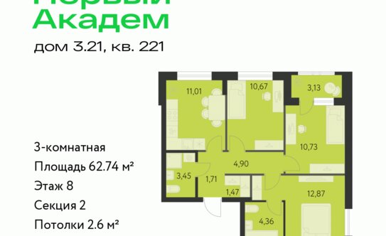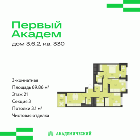 - трёхкомнатные — 8 планировок площадью от 61,8 до 75,8 кв. м;
