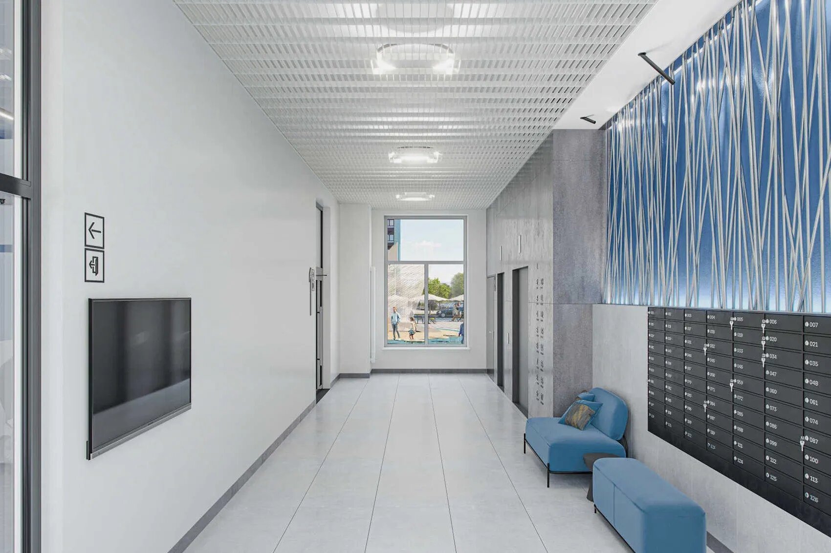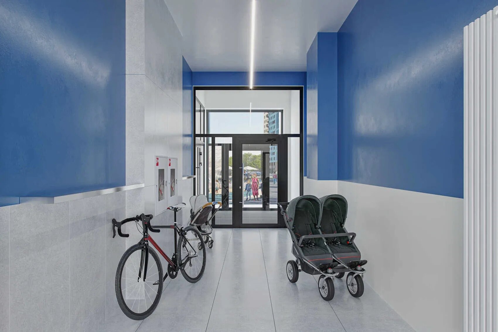 Входные группы. В ЖК «Прибрежный парк» все входные группы расположены на уровне земли, поэтому у маломобильных жителей, родителей с колясками и велосипедистов не будет возникать неудобств при входе в дом. В подъездах спроектированы специальные помещения для хранения велосипедов и колясок. На -1 этаже находятся индивидуальные кладовые. Холлы — просторные и светлые, с панорамным остеклением, интерьерные композиции с настенными светильниками похожи на волны.