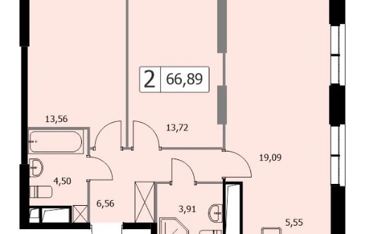 Двухкомнатные квартиры площадью от 54,7 до 73,4 кв. м. В квартирах по две изолированные комнаты, большие кухни, совмещённые или раздельные санузлы. Есть вариант планировки с гардеробной комнатой и двумя санузлами.