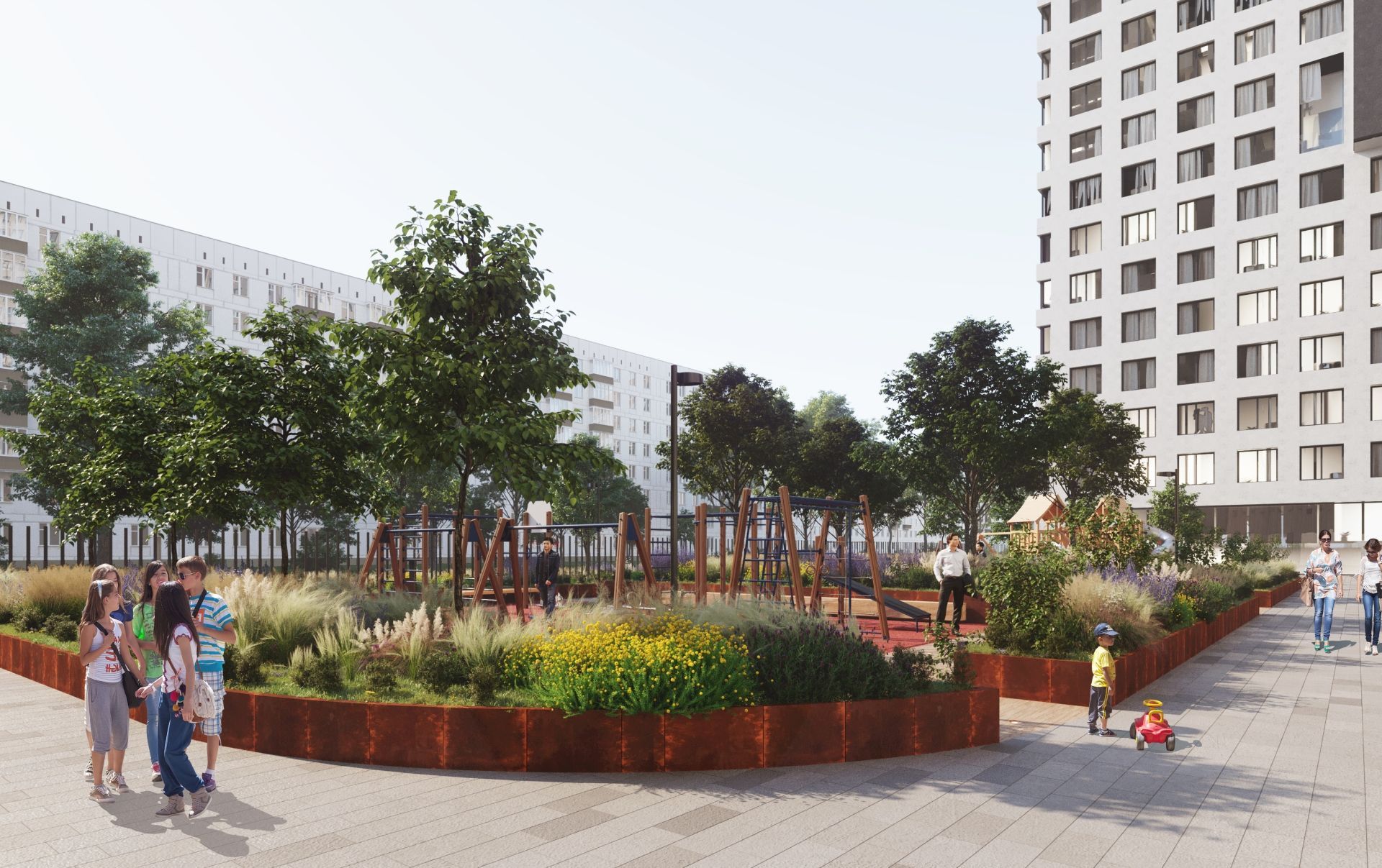 Для детей. На территории ЖК Self размещены детские площадки с песочницами, качелями, конструкциями для физической активности, горками и пр.