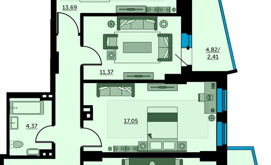 Двухкомнатные квартиры площадью от 53,06 до 116,31 кв. м. В таких планировках по две изолированные комнаты, совмещённые санузлы, застеклённые балконы. Есть планировки с двумя балконами, открытыми террасами.