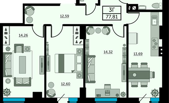 Трёхкомнатные квартиры площадью от 76,18 до 101,7 кв. м. В них по три изолированные комнаты, предусмотрены раздельные санузлы, застеклённые балконы. Есть планировки с террасами, гардеробными комнатами.