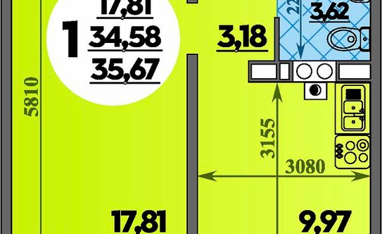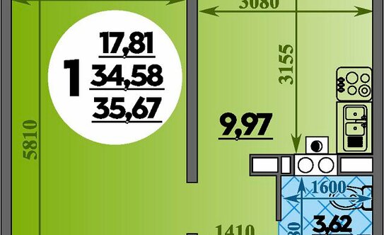 Однокомнатные квартиры площадью от 35,67 до 48,57 кв. м. В них совмещённые или раздельные санузлы, застеклённые балконы.
