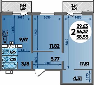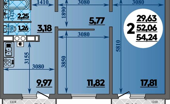 Двухкомнатные квартиры площадью от 54,24 до 58,5 кв. м. В этих квартирах по две изолированные комнаты, раздельные санузлы, по два застеклённых балкона.