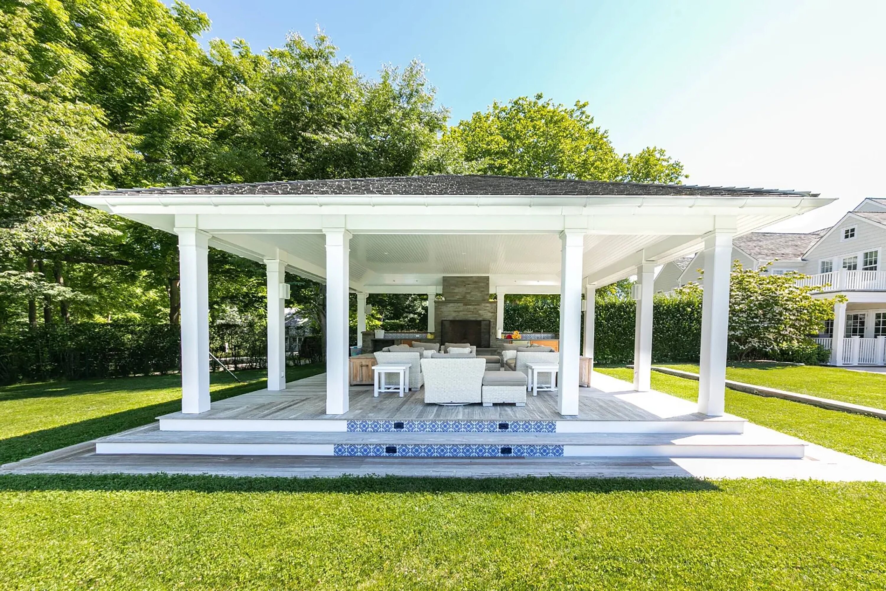 Детские и гостевые спальни находятся наверху, а во дворе нашлось место для открытого бассейна, джакузи, цветущего сада и уютной зоны отдыха в тени большого зонта.