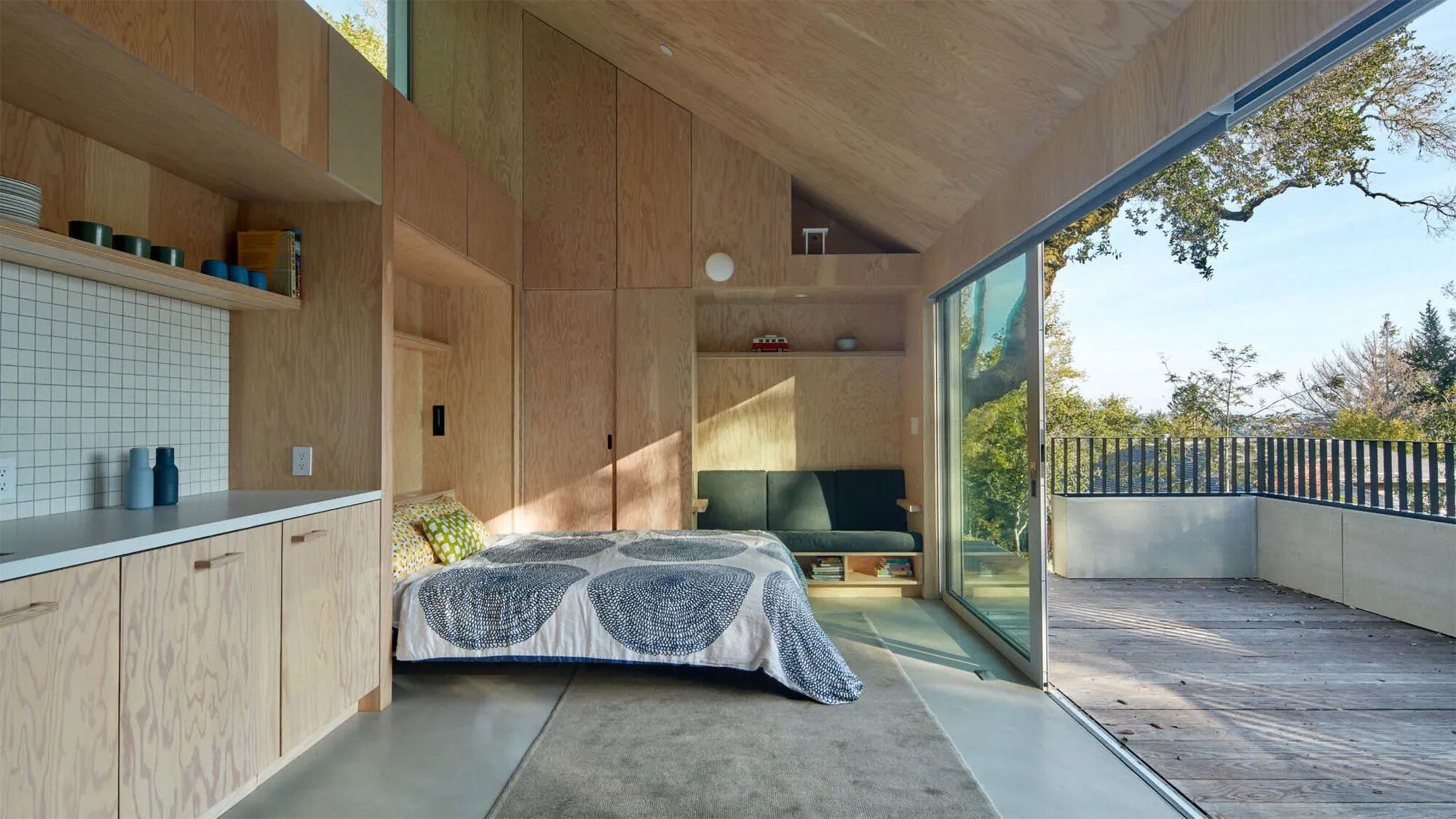 Каждый квадратный метр небольшого домика функционален: откидная кровать ночью выступает местом для сна, а днём прячется в стену, на чердак ведёт компактная лестница, а кухонный стол перемещается на колёсиках — его можно выкатить на веранду, чтобы обедать на свежем воздухе.
