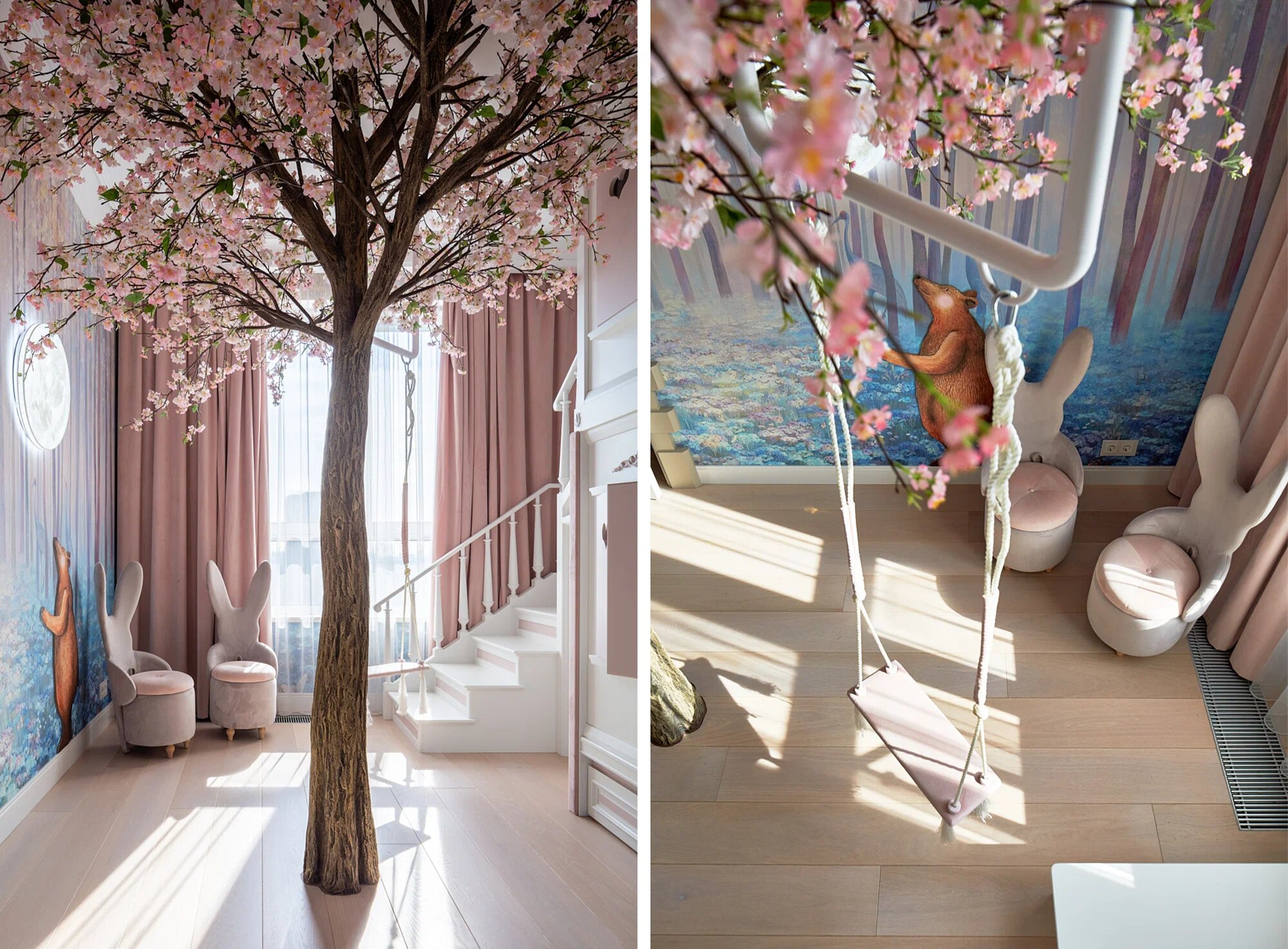 Проект отличает внимание к деталям, индивидуальным подходом к каждой зоне и использованием дорогих материалов: чего стоит только стена из натурального оникса. Также эффектное решение — детская игровая комната с искусственным деревом, встроенным прямо в пол.