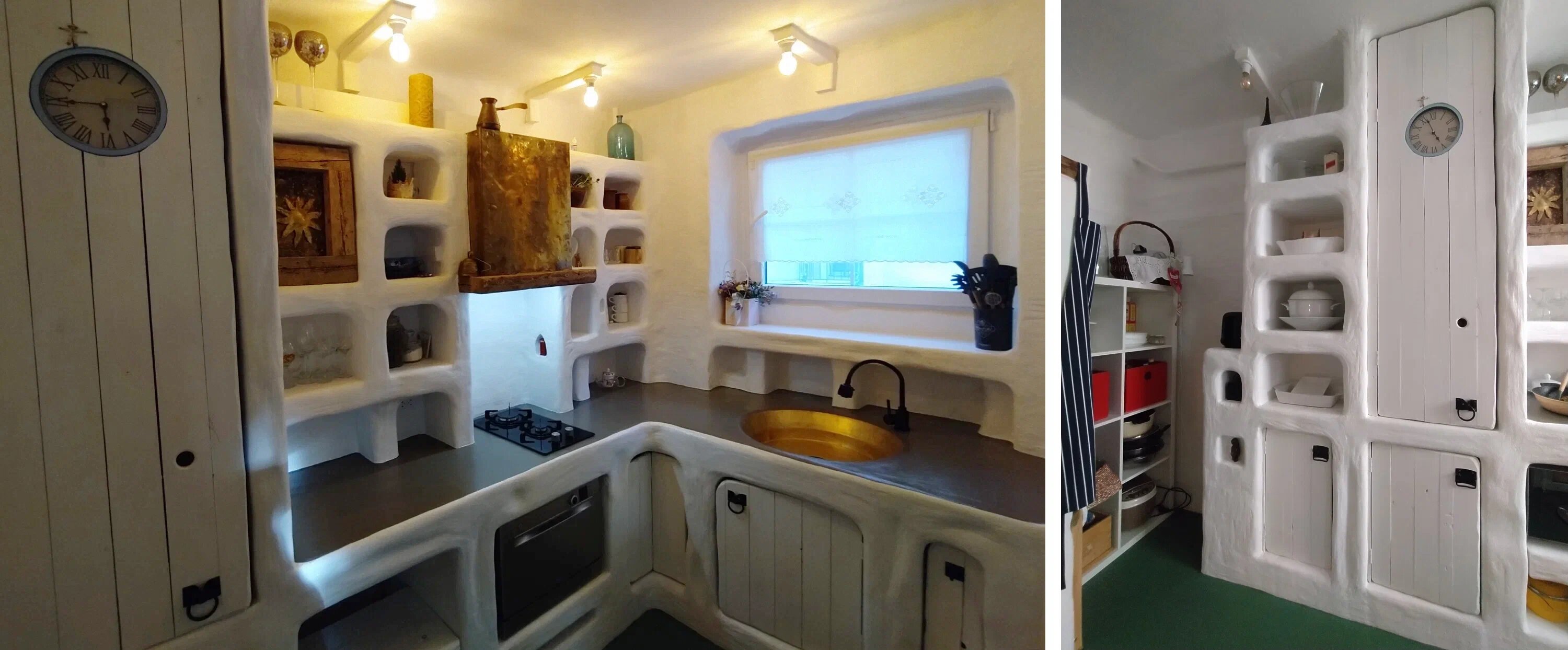 Вместо привычной отделки они использовали технику мазанки с цементом и гипсовой штукатуркой. Кухню творили прямо на месте, корректируя форму во время работы, и интегрировали в интерьер старинные находки. Эта квартира в полной мере отражает характер хозяев, благодаря чему заслуживает номинации «самый творческий ремонт».
