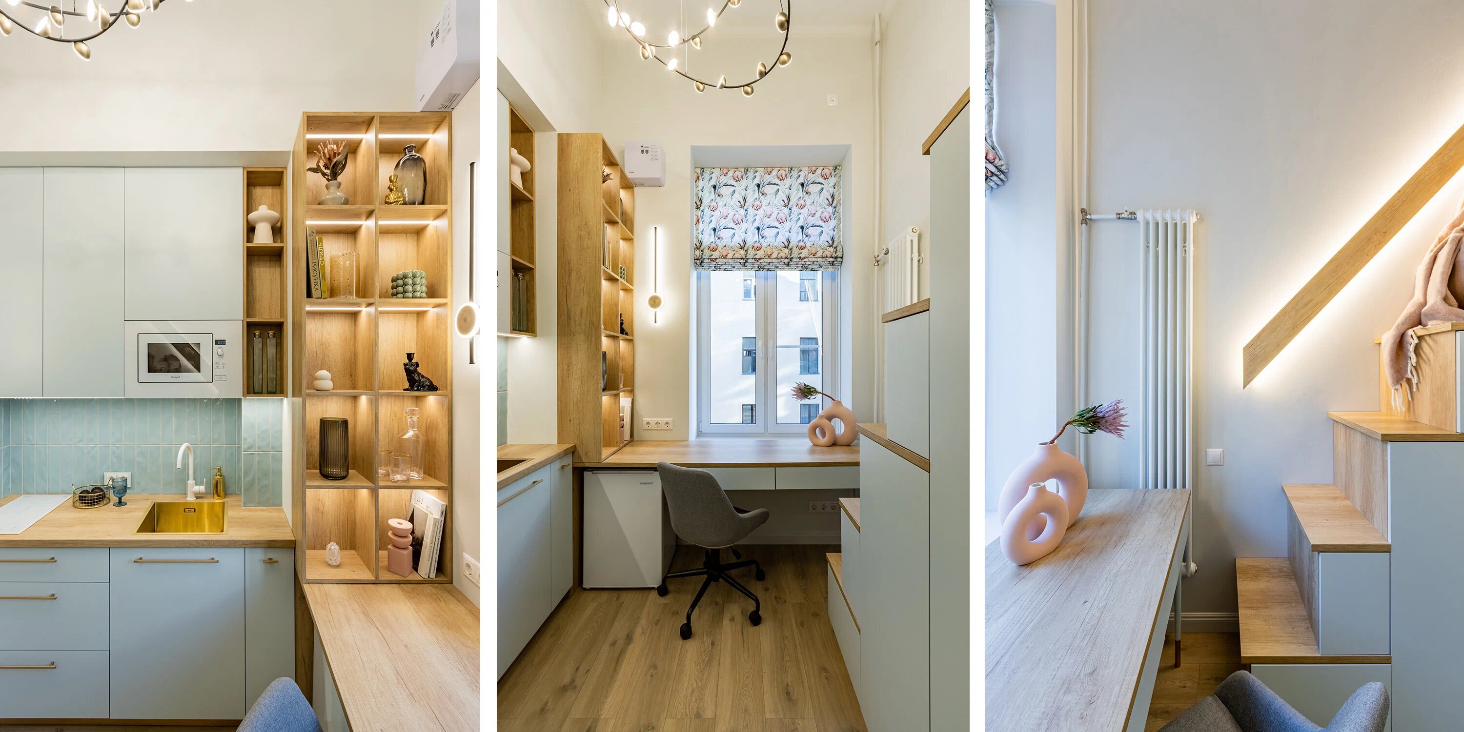 Дизайнер подошла к задаче ответственно: вертикальные решения, встроенная мебель, компактная кухня, рабочее место, комфортная кровать и множество скрытых систем хранения. Даже стиральная машина поместилась!