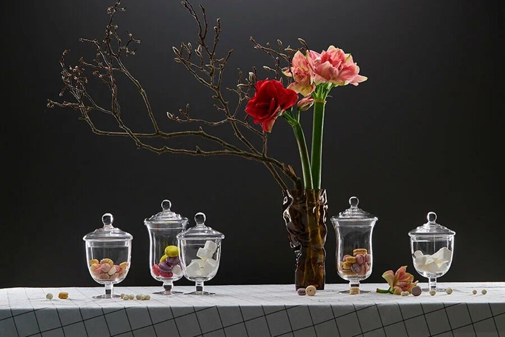 Сочетание разных фактур стекла — матового, сатинового или с лёгким металлическим блеском — работает особенно эффектно: такие детали красиво ловят свет свечей и делают сервировку глубже и выразительнее.