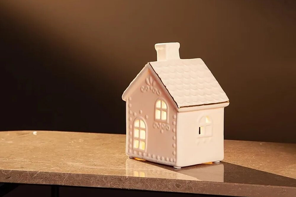 Если скатерть белая и хочется сделать стол выразительнее, добавьте несколько ярких акцентов: свечи, домики, золотистые детали. Они легко создают ощущение праздника и подчёркивают чистый, светлый фон.