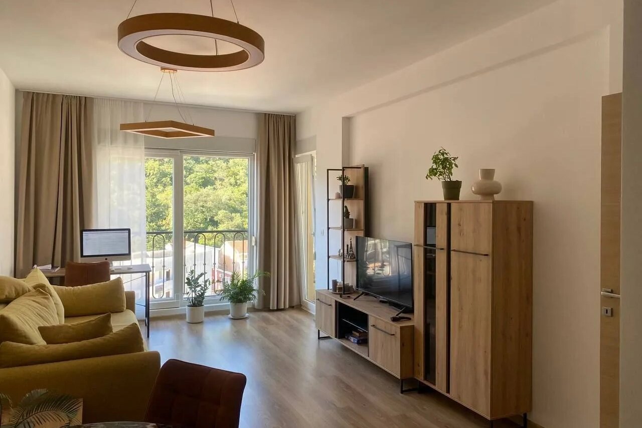 Шикарный вид из окон, одна спальня, красивая гостиная и всё необходимое рядом с домом. А ещё можно арендовать подземный паркинг — но уже за дополнительную плату. Угадайте, где находится квартира и сколько стоит её аренда?