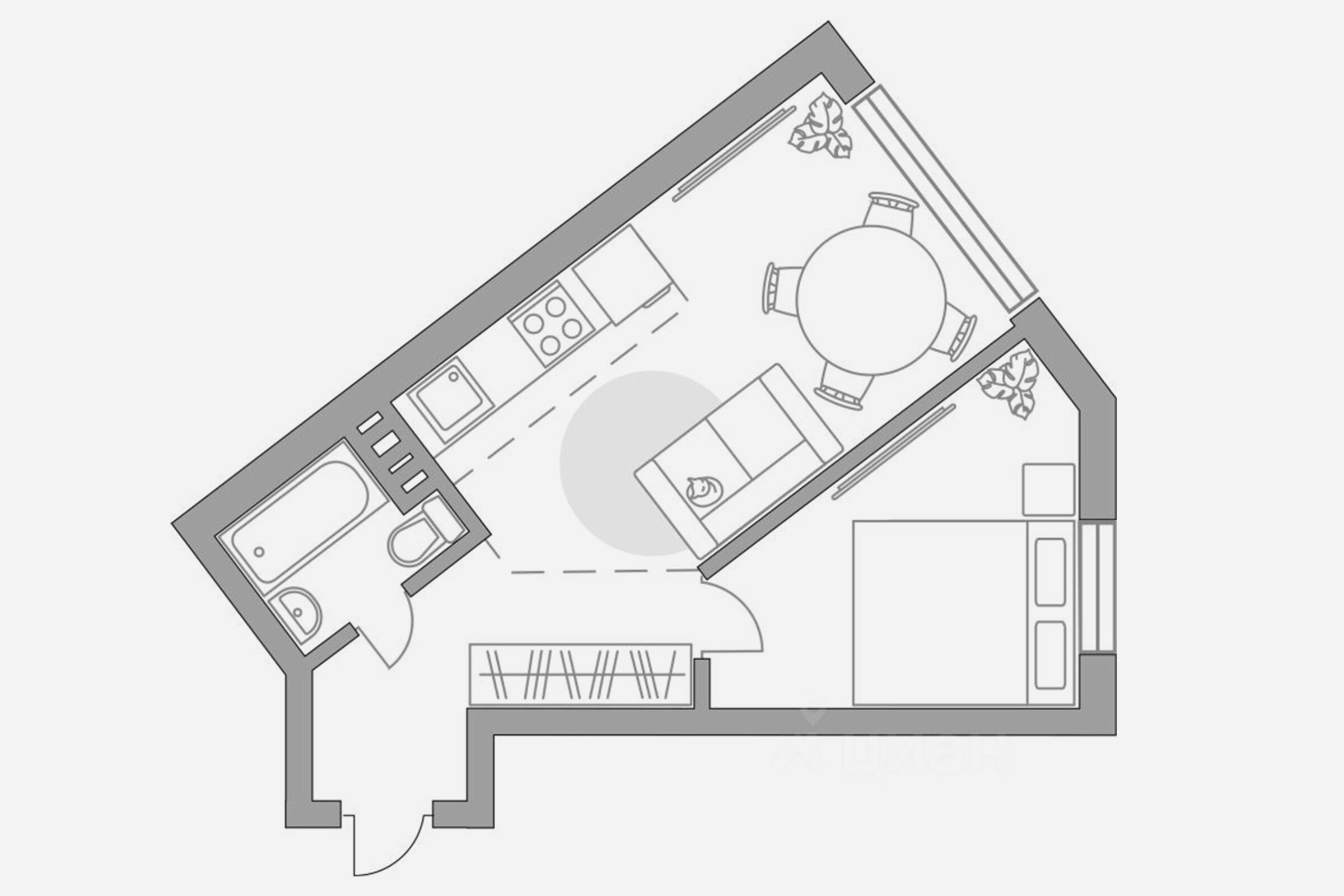 Этот вариант для тех, кому нужно больше воздуха и меньше перегородок. Зонирование достигается за счёт мобильных и визуальных решений.