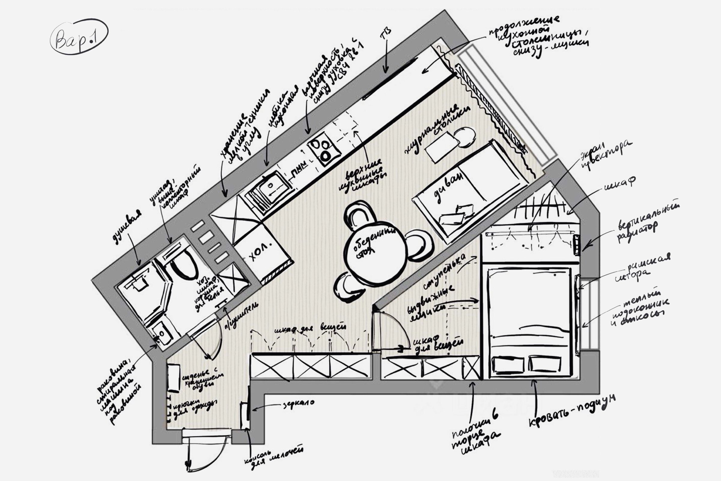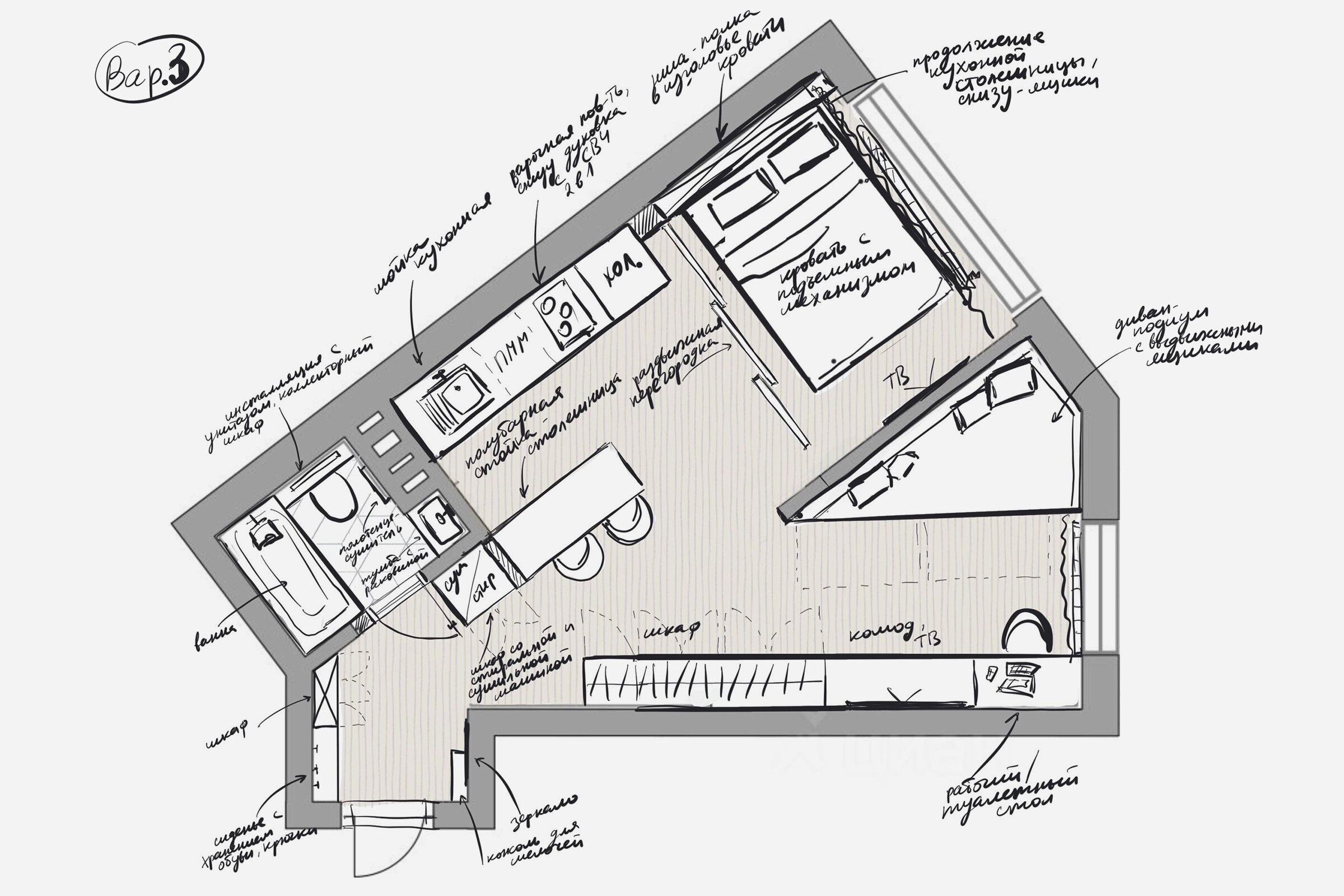 Кухня-гостиная: кухонная зона осталась на своём месте, но получила длинную линейную компоновку. Холодильник — в углу, большой шкаф для мелкой техники, мойка, посудомоечная машина на 45 см. Для экономии места духовой шкаф и микроволновка объединены в один прибор, установленный под варочной поверхностью. Далее столешница продолжается к окну, под ней — дополнительное хранение. В зоне гостиной — диван (возможно, раскладной) и телевизор.