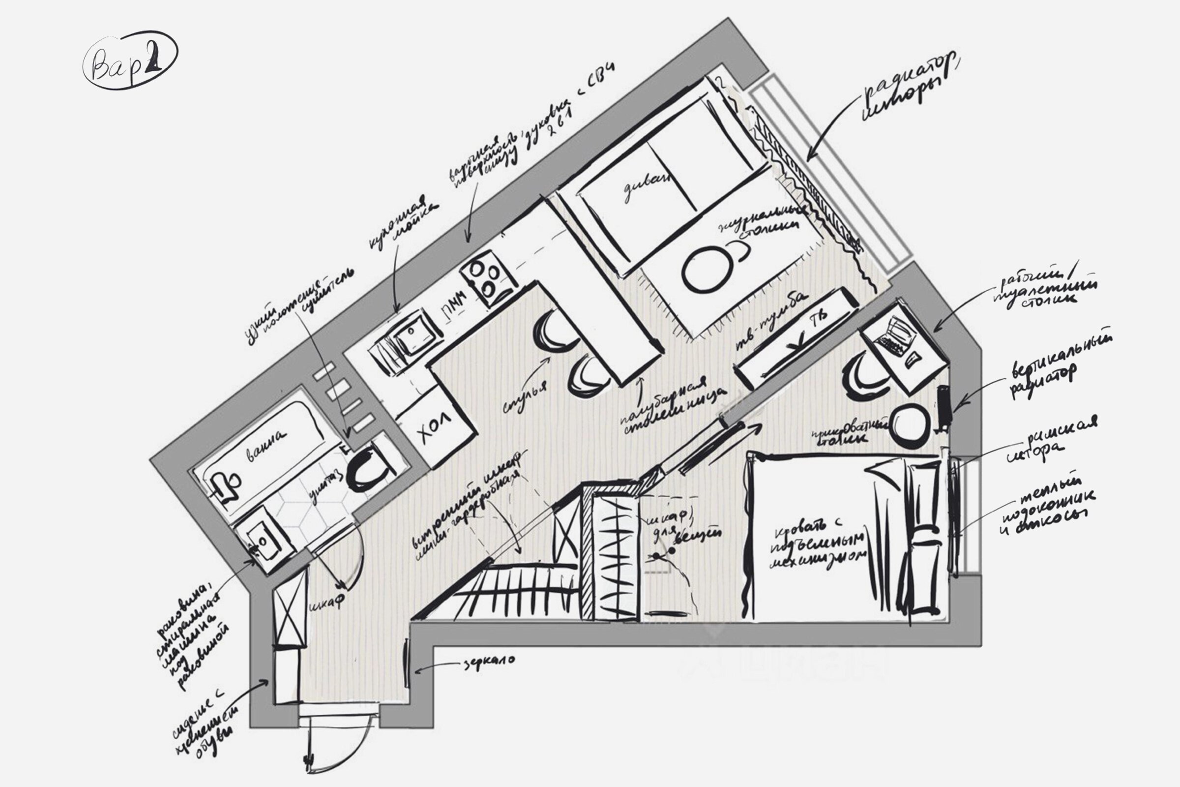 К нам обратился читатель, который купил квартиру со специфической планировкой в ЖК «Театральный парк», а мы попросили Юлию Андрееву, арт-директора компании Domeo, разобраться в этой непростой квартире и предложить несколько сценариев — от решений без перепланировки до более радикальных вариантов. Ниже — три подхода с разной степенью вмешательства и логикой, на которую стоит опираться при выборе.