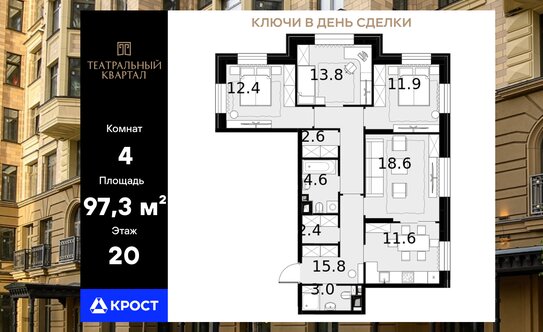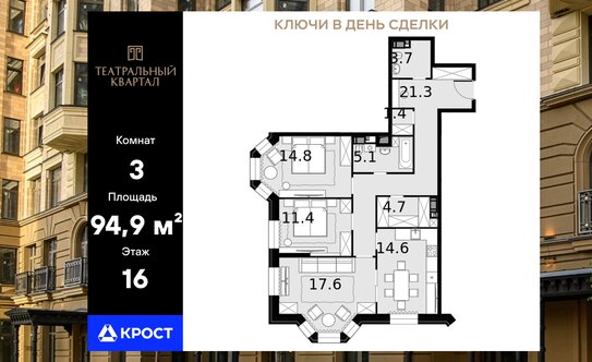 Сталинка на Чёрной Речке, 3-комнатная квартира, площадь 84 кв. м