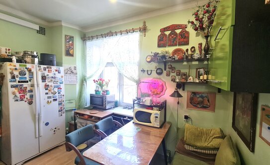 Наш дом находится на Севастопольском проспекте. Когда-то на месте нашего микрорайончика были сады. И сейчас возле дома растут слива, малина, яблони, вишни. Район у нас очень уютный, не похожий на современную, урбанистическую Москву. Наша квартира — бывшая коммуналка в доме 1956 года. Три комнаты, 72 метра. Две из них были смежными. Задолго до того, как мы купили квартиру в 2011 году, здесь сделали перепланировку — разделили комнаты. По идее, квартиру можно даже сделать четырёхкомнатной, так как в ней пять окон. Но это сложные согласования, большие деньги.