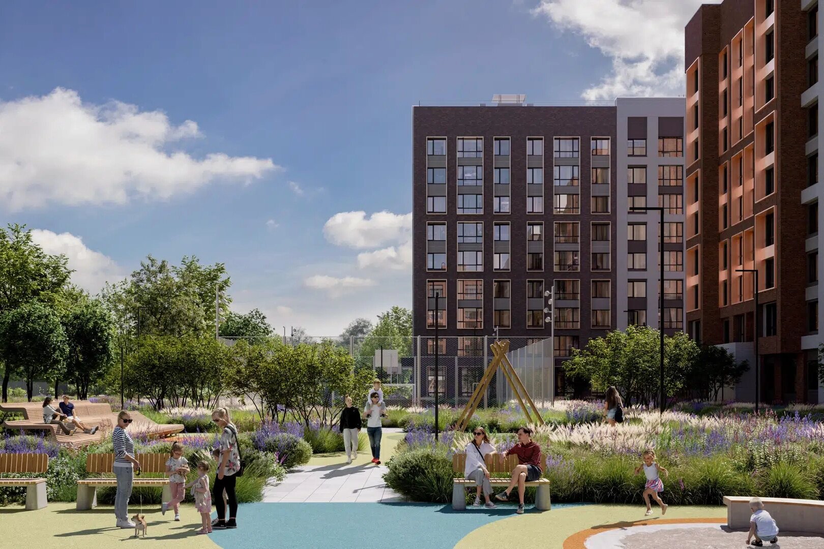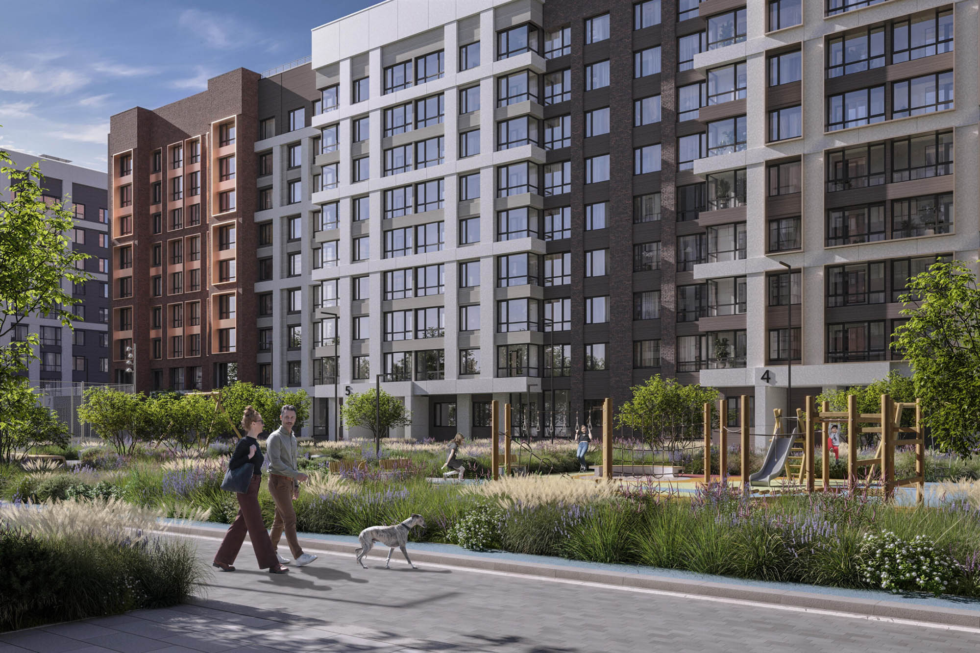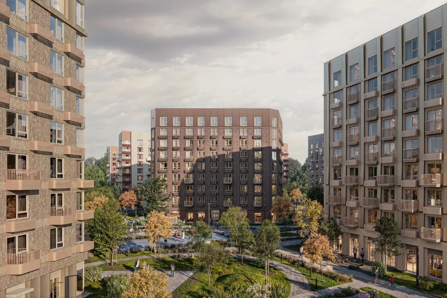 Комплекс состоит из шести жилых корпусов высотой 23-24 этажа, вмещающих 4,8 тыс. квартир. На первых этажах домов откроются магазины, аптеки, кафе и различные сервисы. Дворы будут закрыты от машин, там проведут озеленение и разместят спортивные и детские площадки. В подъездах предусмотрены колясочные и помещения для консьержей. В шаговой доступности расположены школы, детские сады, поликлиники.