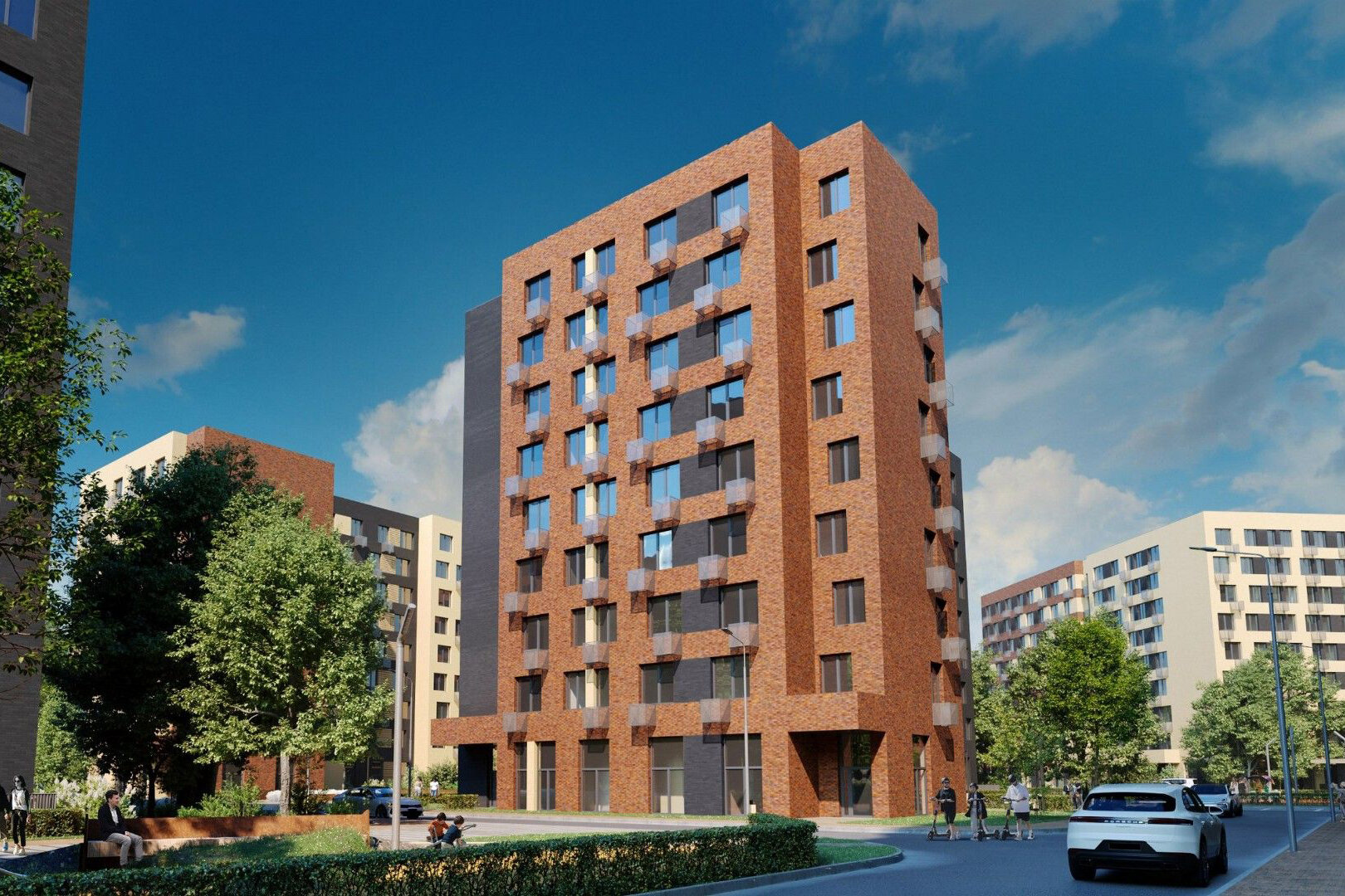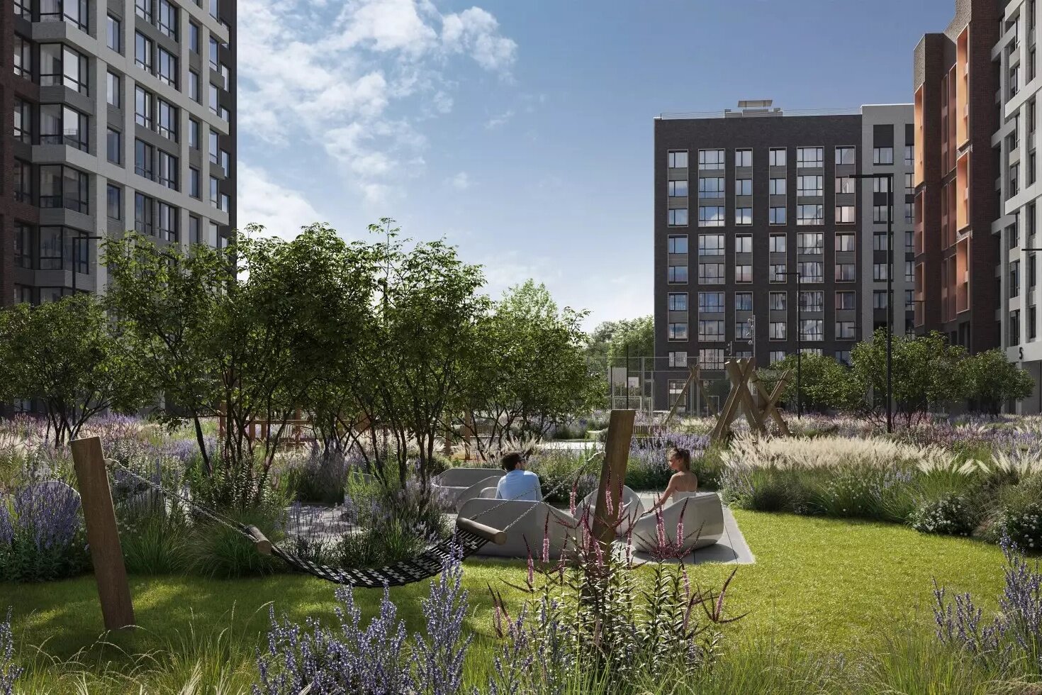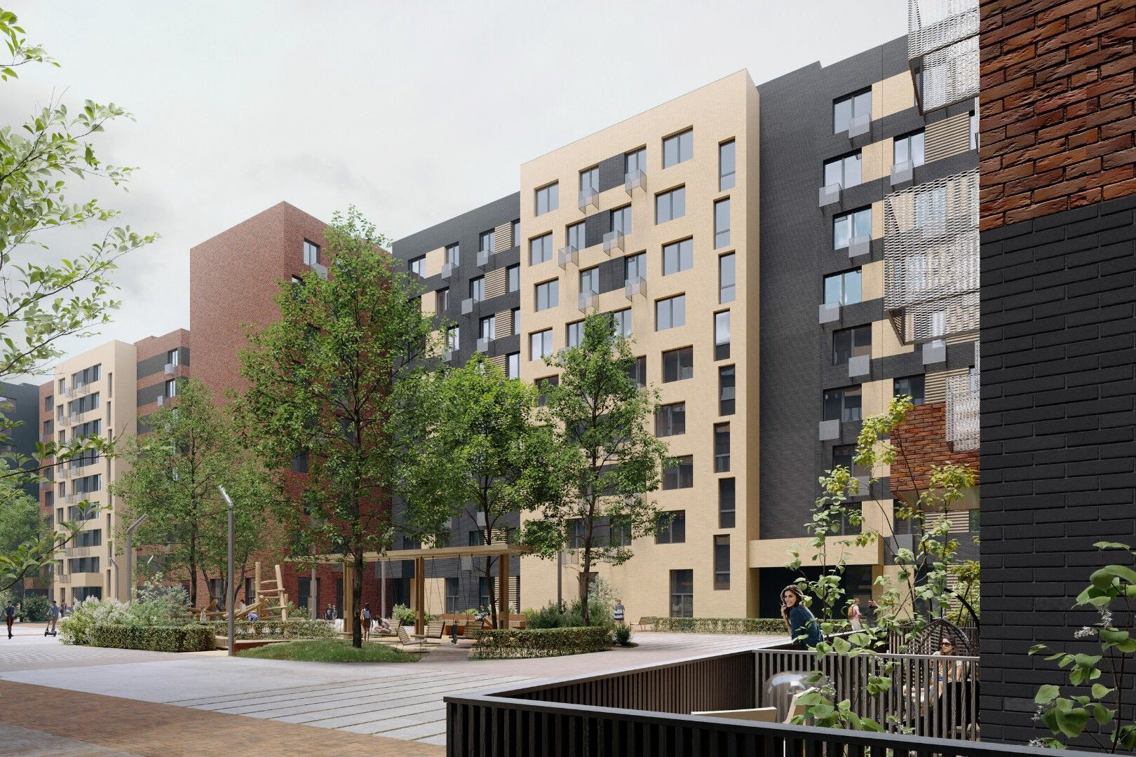 Комплекс состоит из шести жилых корпусов высотой 23-24 этажа, вмещающих 4,8 тыс. квартир. На первых этажах домов откроются магазины, аптеки, кафе и различные сервисы. Дворы будут закрыты от машин, там проведут озеленение и разместят спортивные и детские площадки. В подъездах предусмотрены колясочные и помещения для консьержей. В шаговой доступности расположены школы, детские сады, поликлиники.