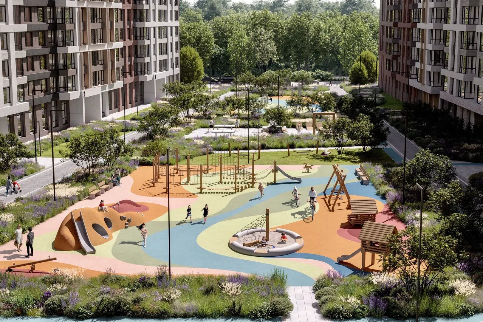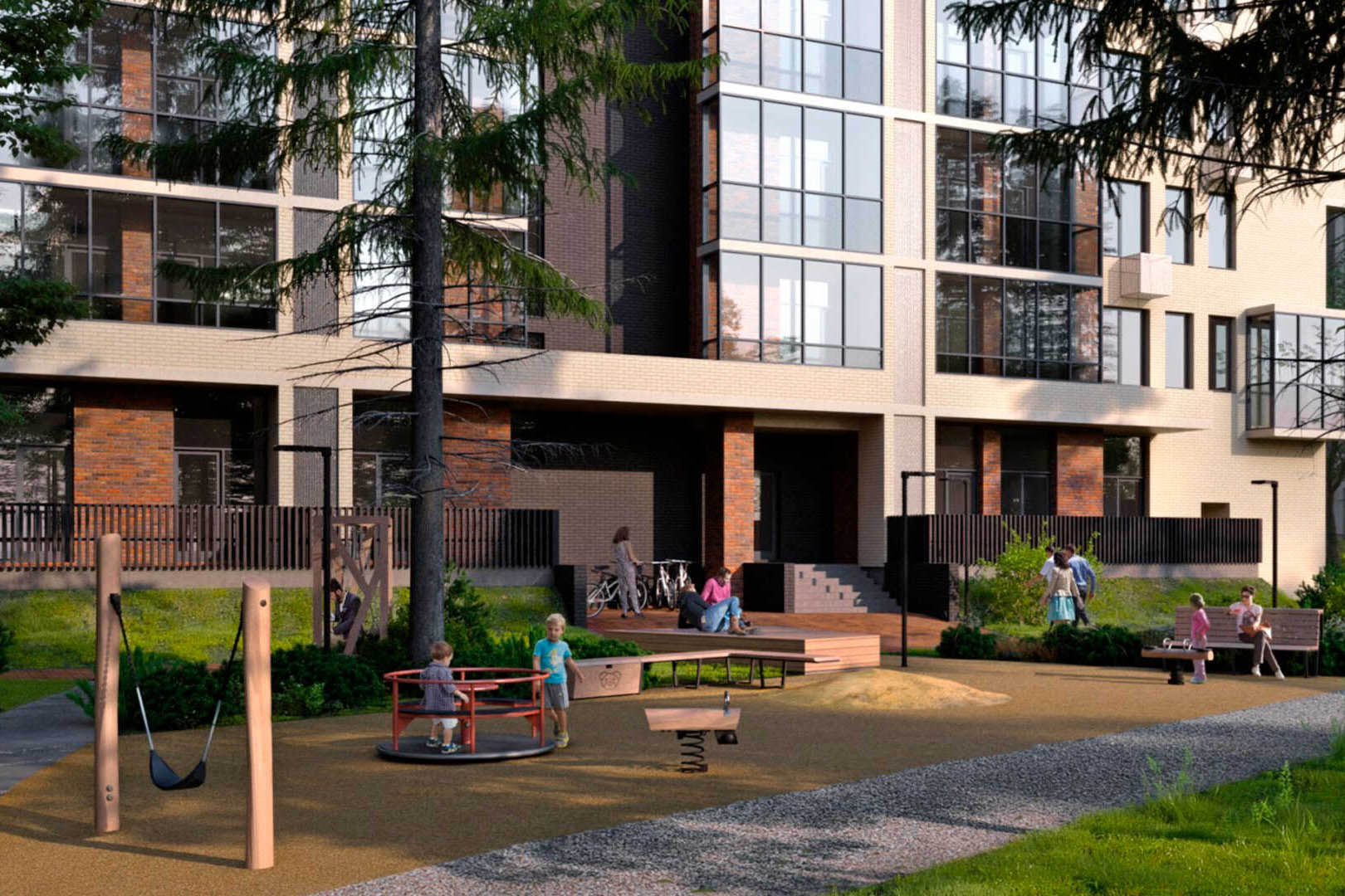 На территории квартала появятся широкий зелёный пешеходный бульвар, а также большой детский плейхаб «Гравити» с холмами, игровыми комплексами, большой песочницей, каруселями, площадкой для игр с водой и пр. В подъездах предусмотрены помещения для колясок и велосипедов. В комплексе также можно приобрести кладовые для хранения спортинвентаря и других сезонных вещей.