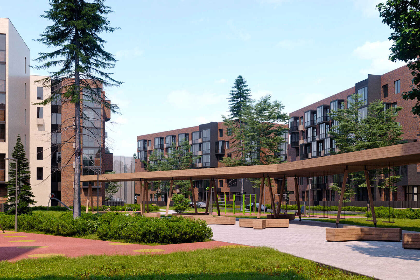Собственная инфраструктура комплекса будет включать два детских сада (государственный и частный), школу на 1100 мест, два наземных многоуровневых паркинга с кладовыми, а также магазины и сервисы на первых этажах домов. В подъездах разместят колясочные. Во дворах оборудуют детские и спортивные площадки. Рядом с ЖК находится большой лесной массив, где можно погулять, а в 1,2 км работает конный клуб.