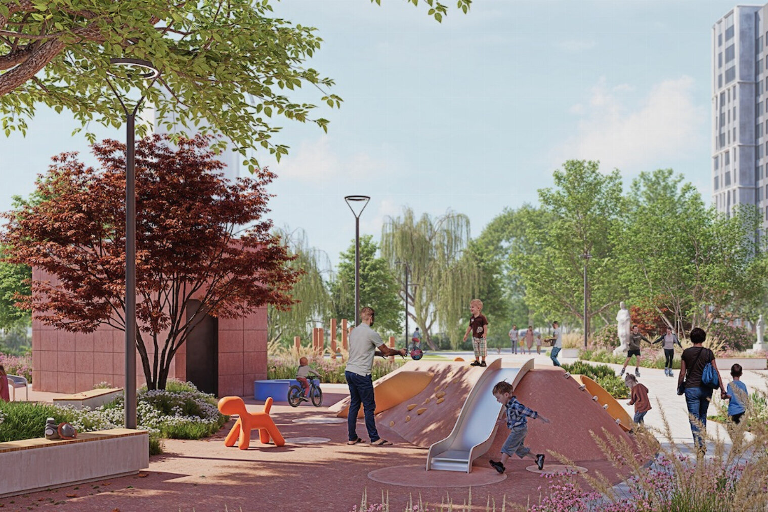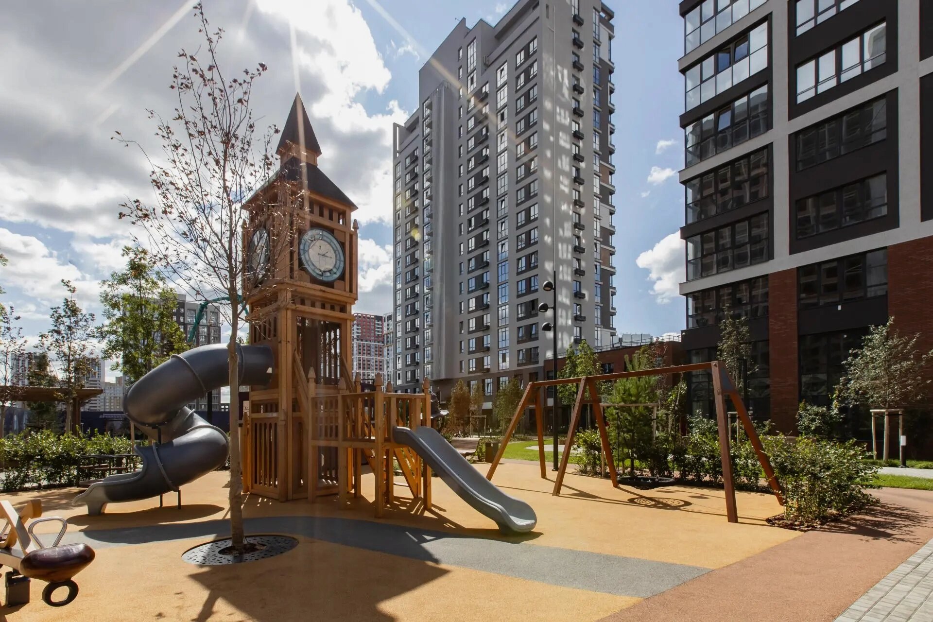 Дворы для машин закрыты, там организованы разновозрастные игровые зоны для детей со скалодромами, песочницами и качелями. На территории есть также крытые площадки и пруд. Во дворах по вечерам подсвечиваются пешеходные дорожки. Вдоль реки проходит набережная, где можно погулять.