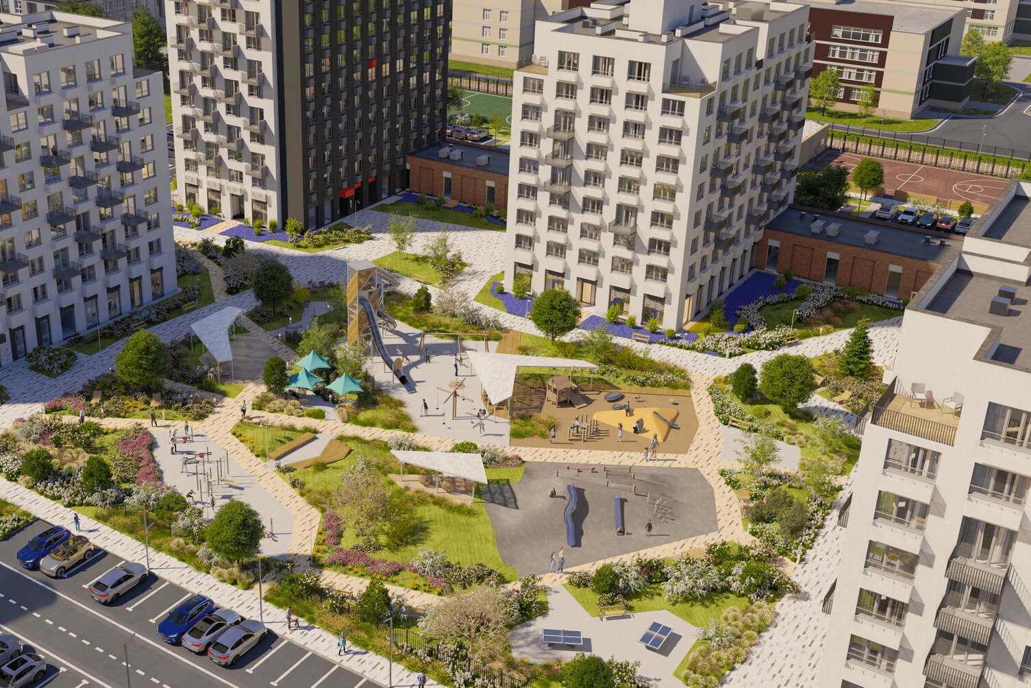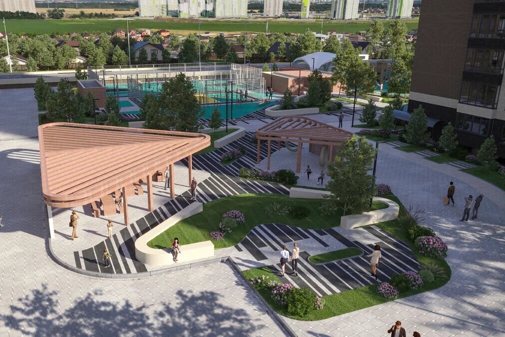 Между домами появится пространство для прогулок с озеленением и тематическими зонами. Для занятий спортом в ЖК запланированы уличные тренажёры, теннисные корты и фитнес-центр. Автомобиль можно будет оставить в многоуровневом наземном паркинге, рассчитанном на 6 400 мест. Коммерческие помещения разместятся на первых этажах паркинга и жилых домов. В холлах предусмотрены зоны ожидания и колясочные.