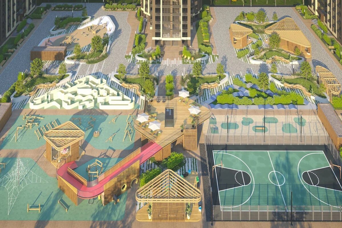 Дворы будут закрытыми от машин и посторонних, в них появятся места для отдыха, детские и спортивные площадки, а также небольшие огороды. Холлы оборудуют мягкой мебелью, санузлом, лапомойкой, колясочной, постаматами и местом для консьержа. Первые этажи корпусов отданы под коммерческую инфраструктуру — магазины, кафе и сервисы. Помещения цокольных этажей оборудуют под спортзалы, мастерские, прачечные и кладовые. Кроме того, застройщик обещает организовать коворкинг.