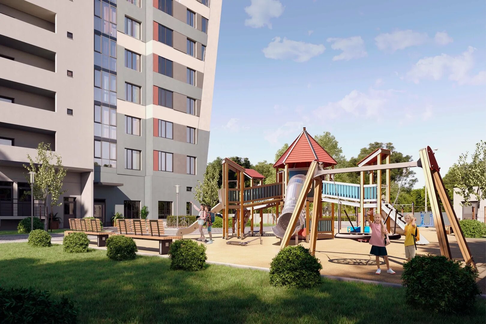 В комплексе предусмотрены закрытый и охраняемый двор с детскими и спортивными площадками, ландшафтный парк со скамейками и аллеями, подземный паркинг на 193 машины, кладовые для габаритных вещей, колясочные в парадных.
