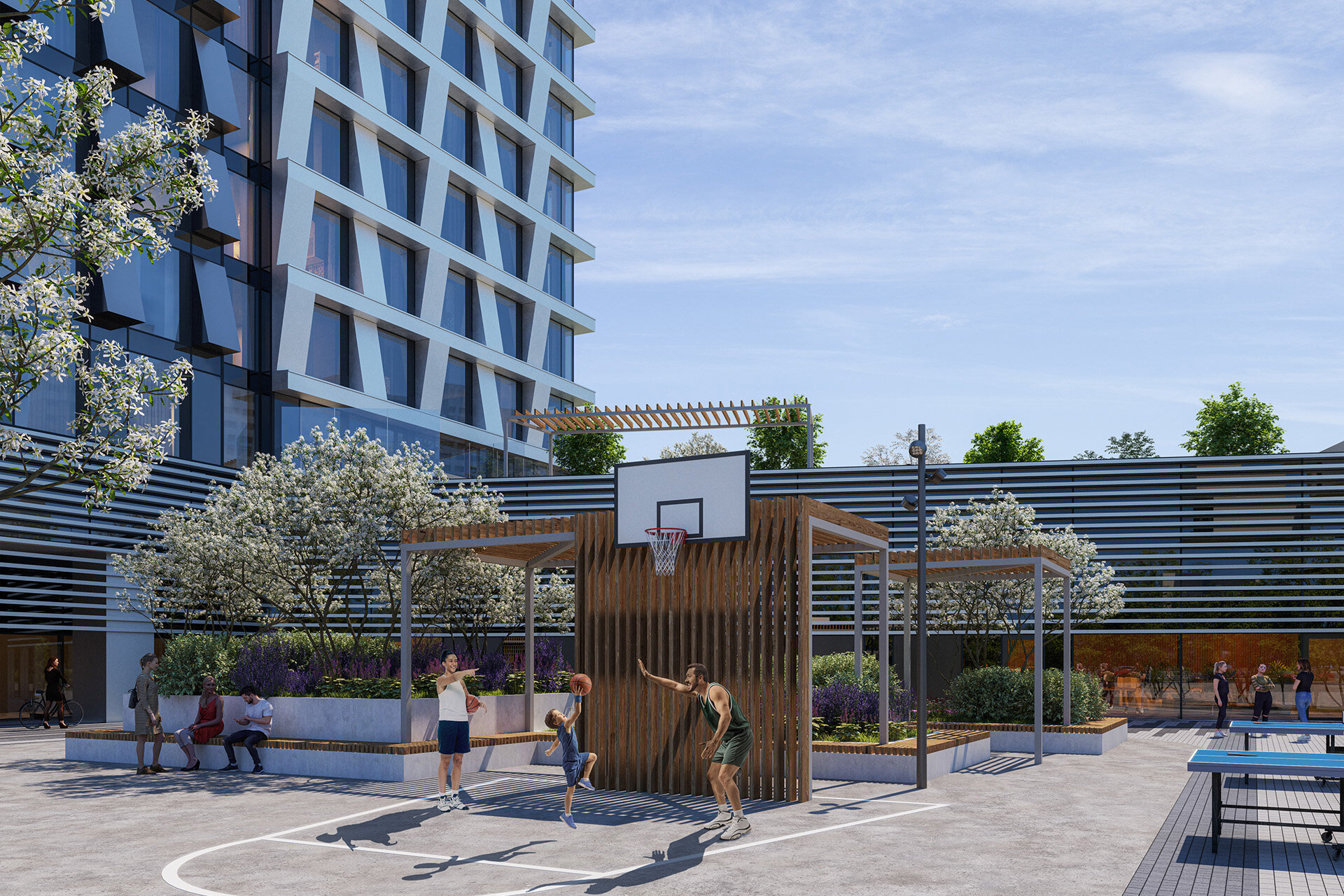 Инфраструктура комплекса будет также включать подземный паркинг на 608 мест, кладовые, просторные лобби с панорамными окнами, мягкими зонами ожидания, детскими игровыми комнатами, санузлами и колясочными. Для жителей будет круглосуточно будет работать консьерж-сервис. Двор в закроют от машин и посторонних, там оборудуют детские и спортивные площадки, променад и амфитеатр.
