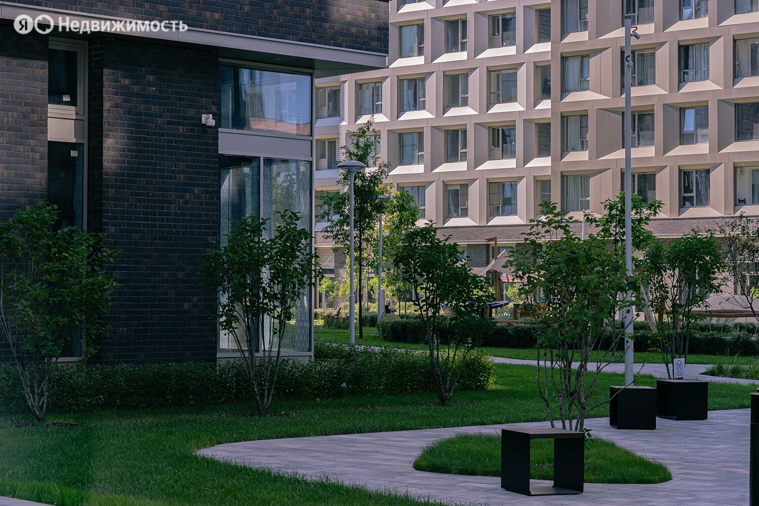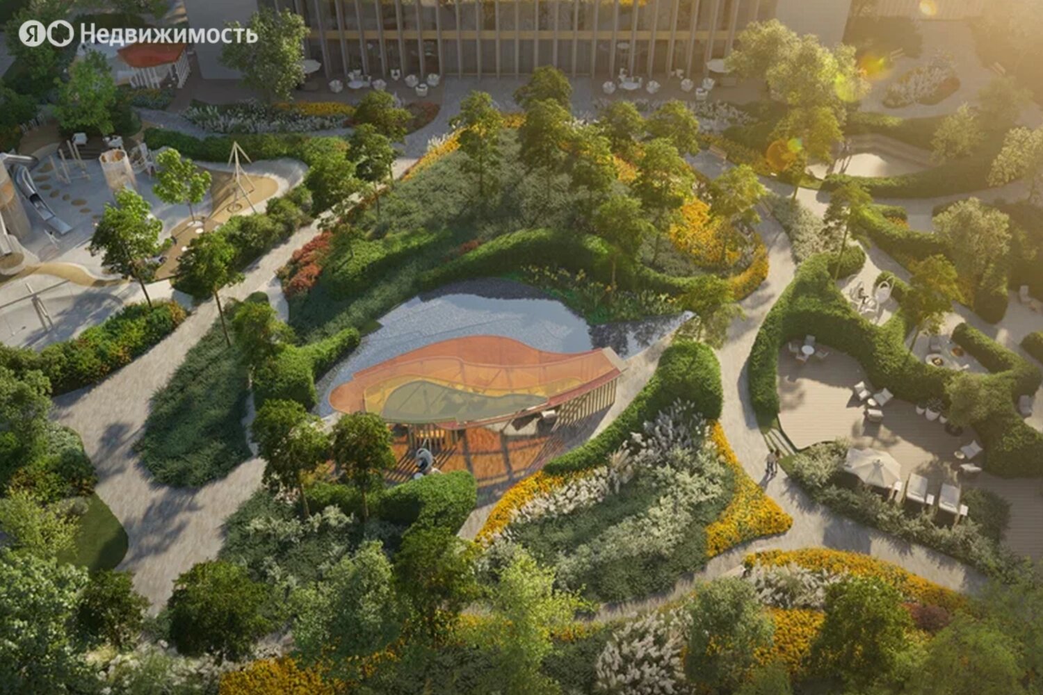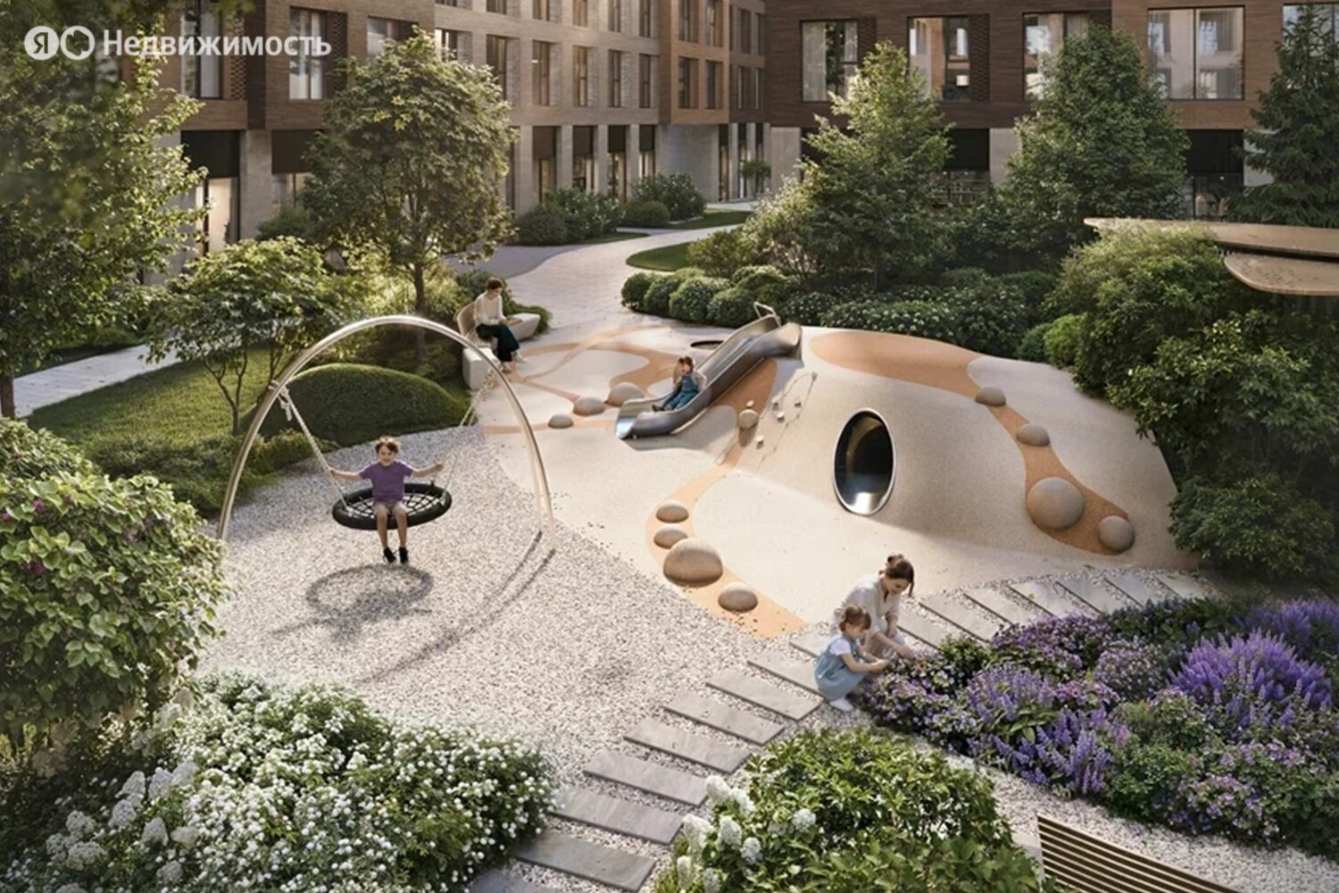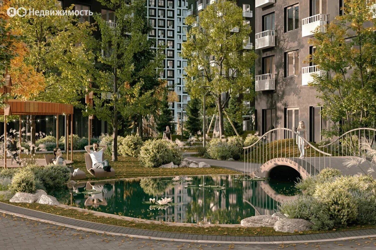 Территория комплекса будет закрыта от посторонних и разделена на функциональные зоны. Застройщик планирует создать двор-лес с хвойными и лиственными деревьями, прудом с «горбатым» мостиком, скамейками и беседками, детскими и спортивными площадками.