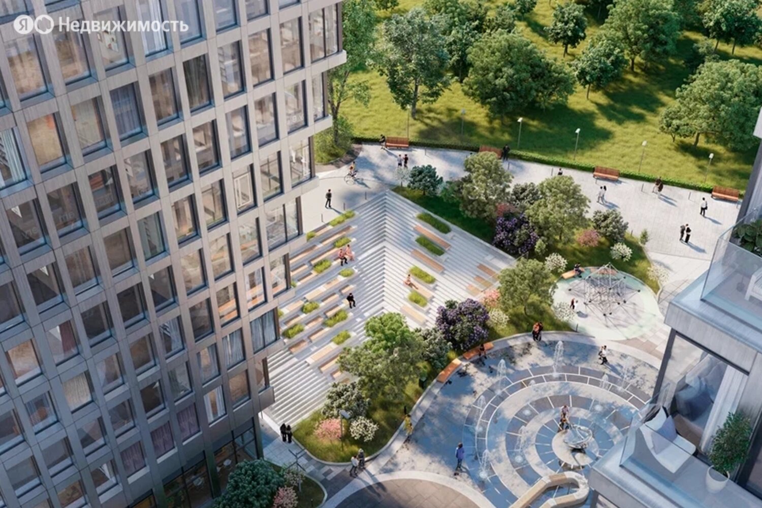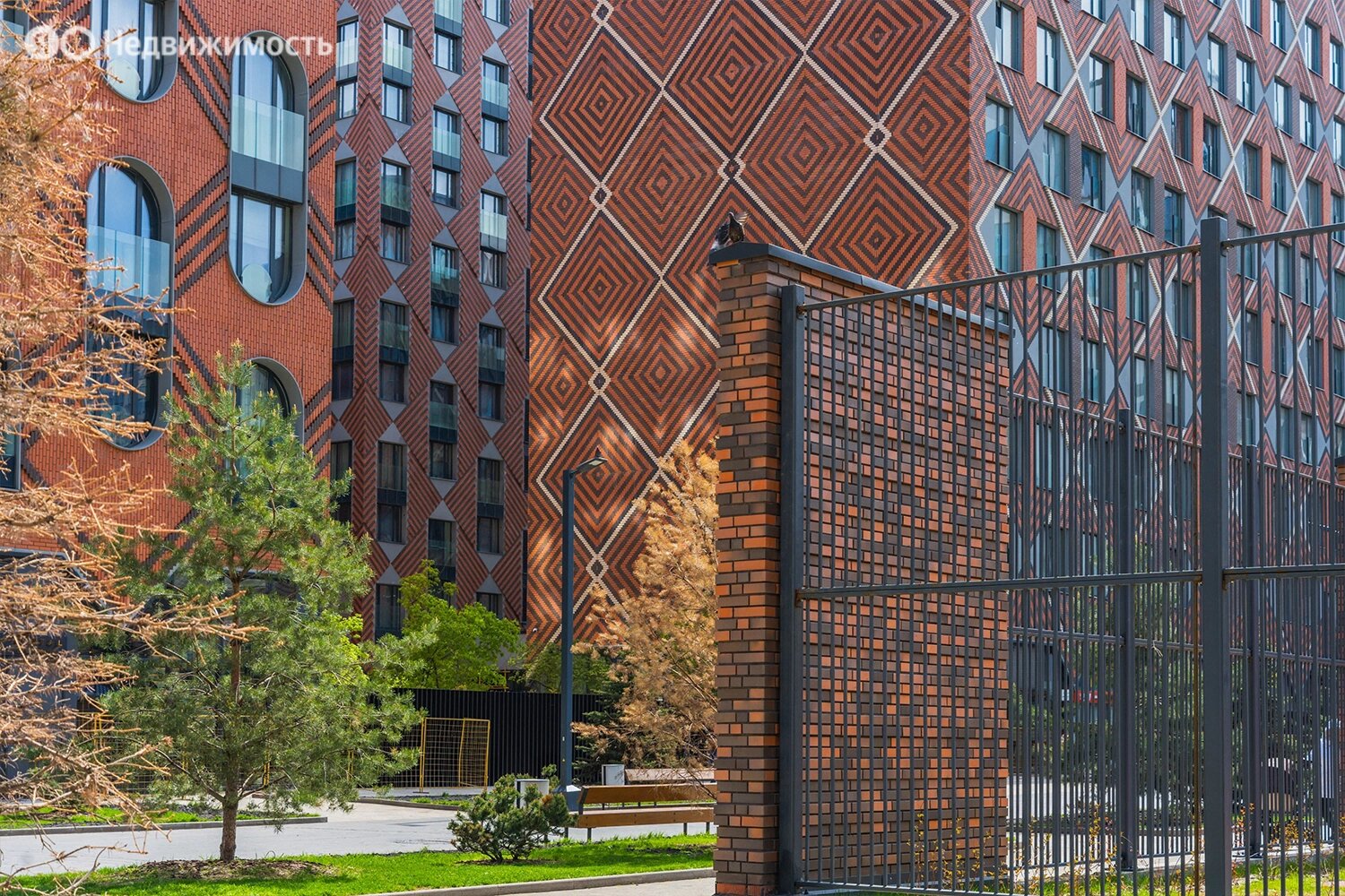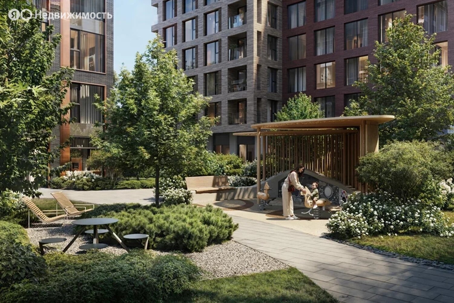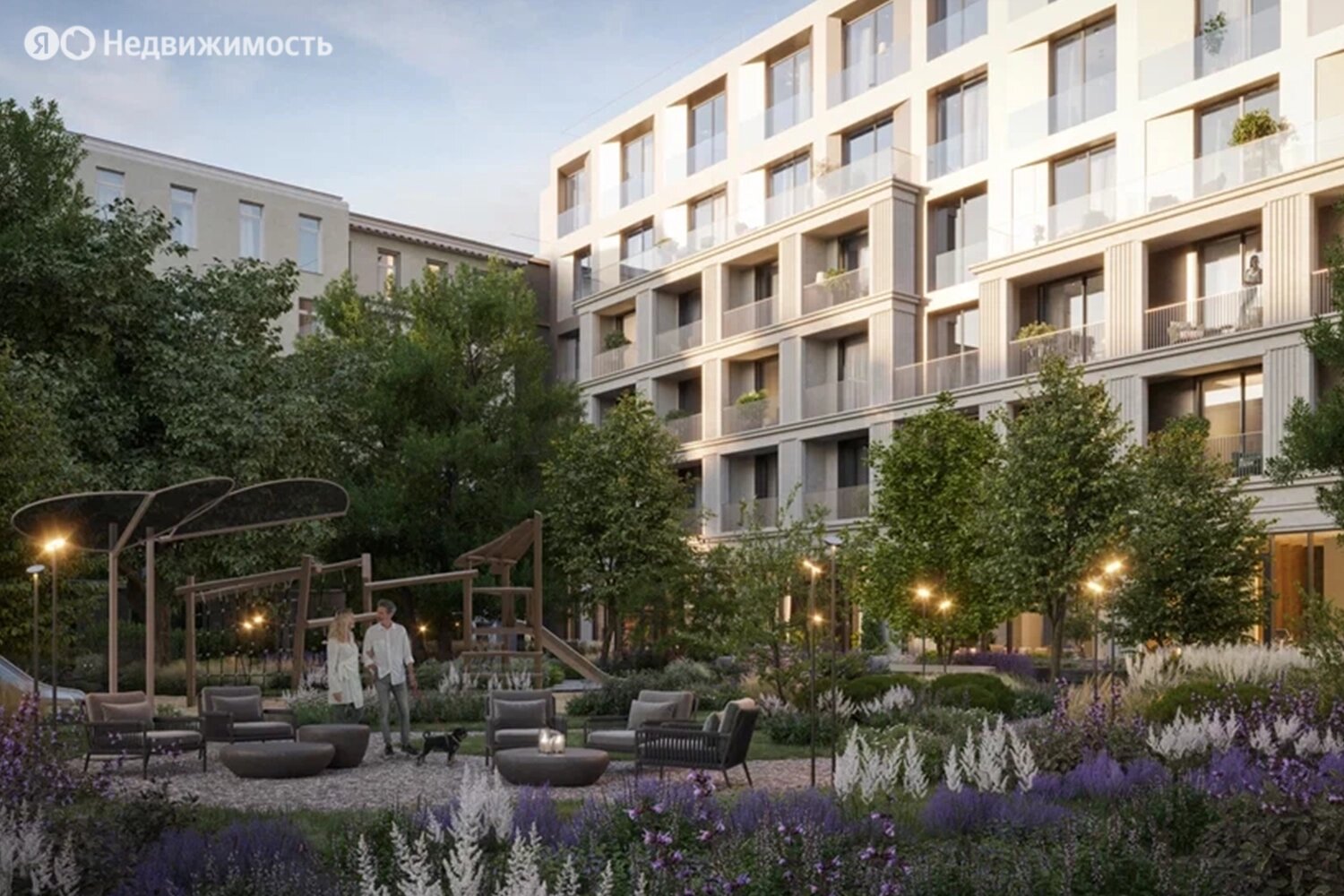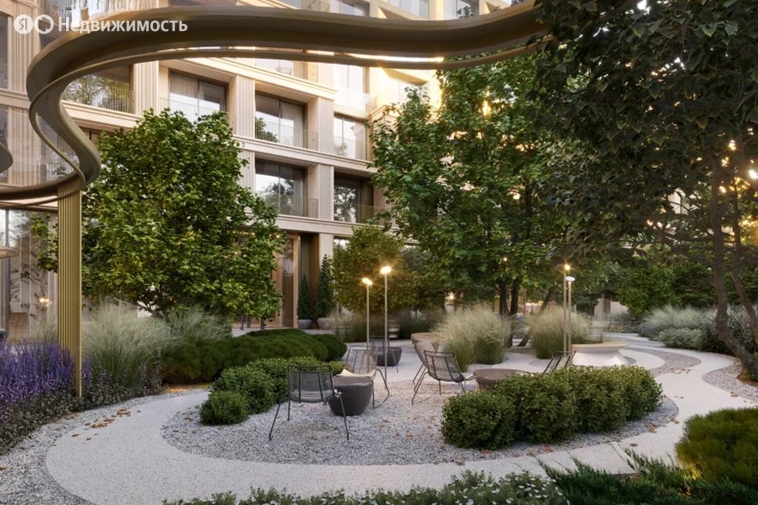 Территория комплекса будет закрыта от посторонних и разделена на функциональные зоны. Застройщик планирует создать двор-лес с хвойными и лиственными деревьями, прудом с «горбатым» мостиком, скамейками и беседками, детскими и спортивными площадками.