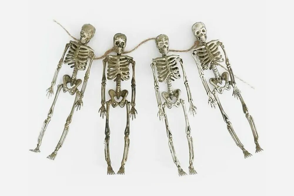 Один большой скелет или много маленьких — для поддержания мрачной праздничной ауры это не так уж важно. Пластиковые костлявые элементы декора можно подвесить на люстру, ручки мебели или просто усадить на свободный стул. А ещё скелеты составляют хорошую молчаливую компанию во время просмотра фильмов.