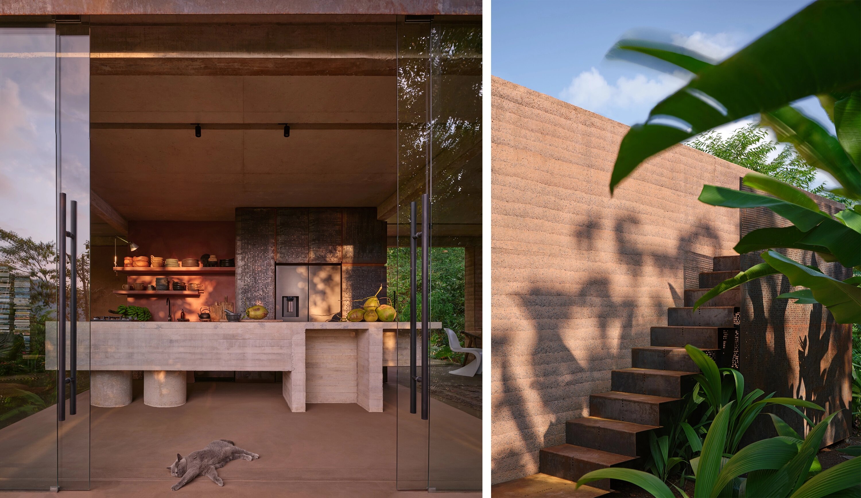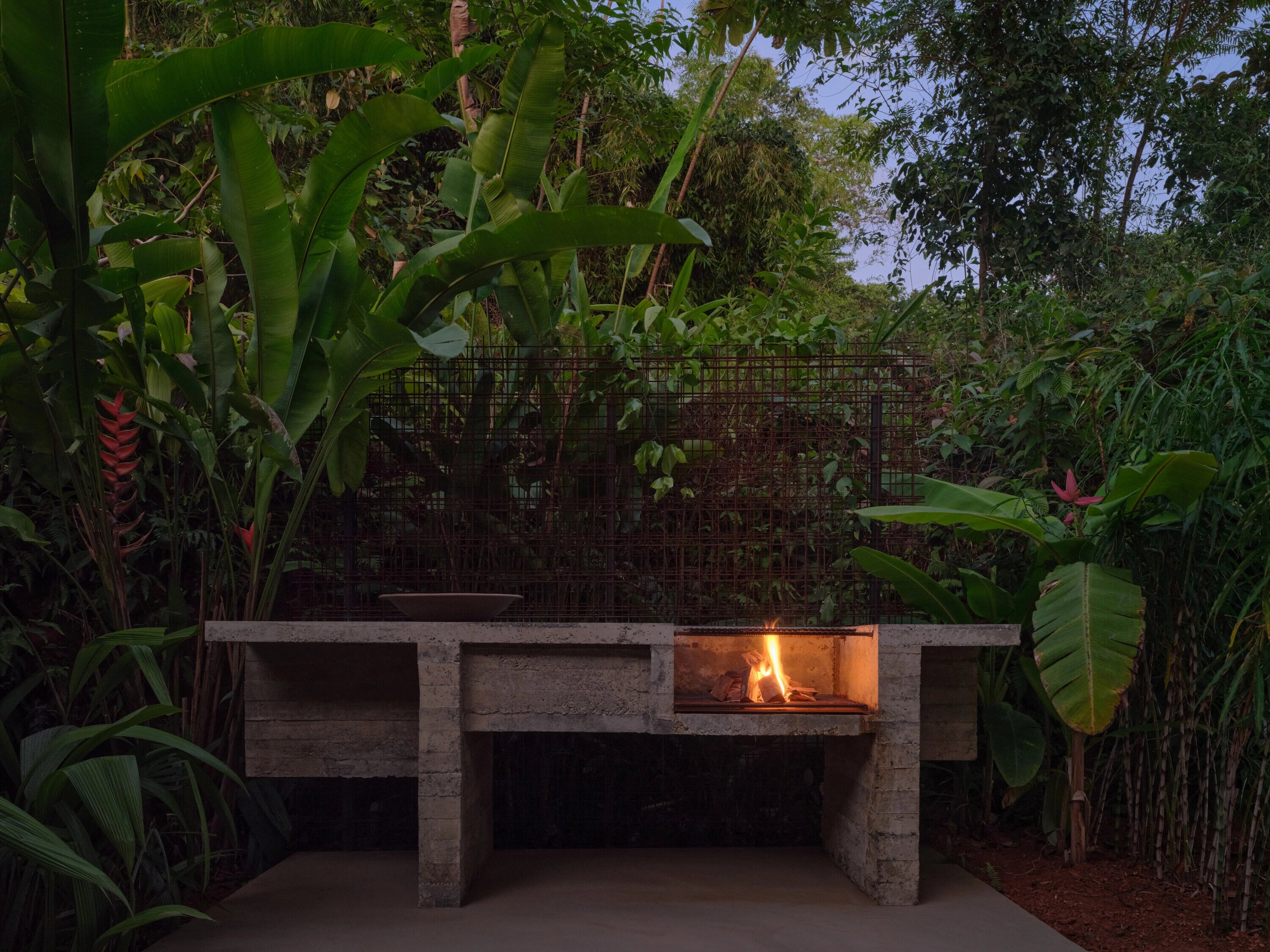 Уникальность проекта — в его контрастах: визуально вилла кажется открытым пространством, но оплетающий её густой лес превращает здание в приватный уголок, скрытый в тени зарослей.