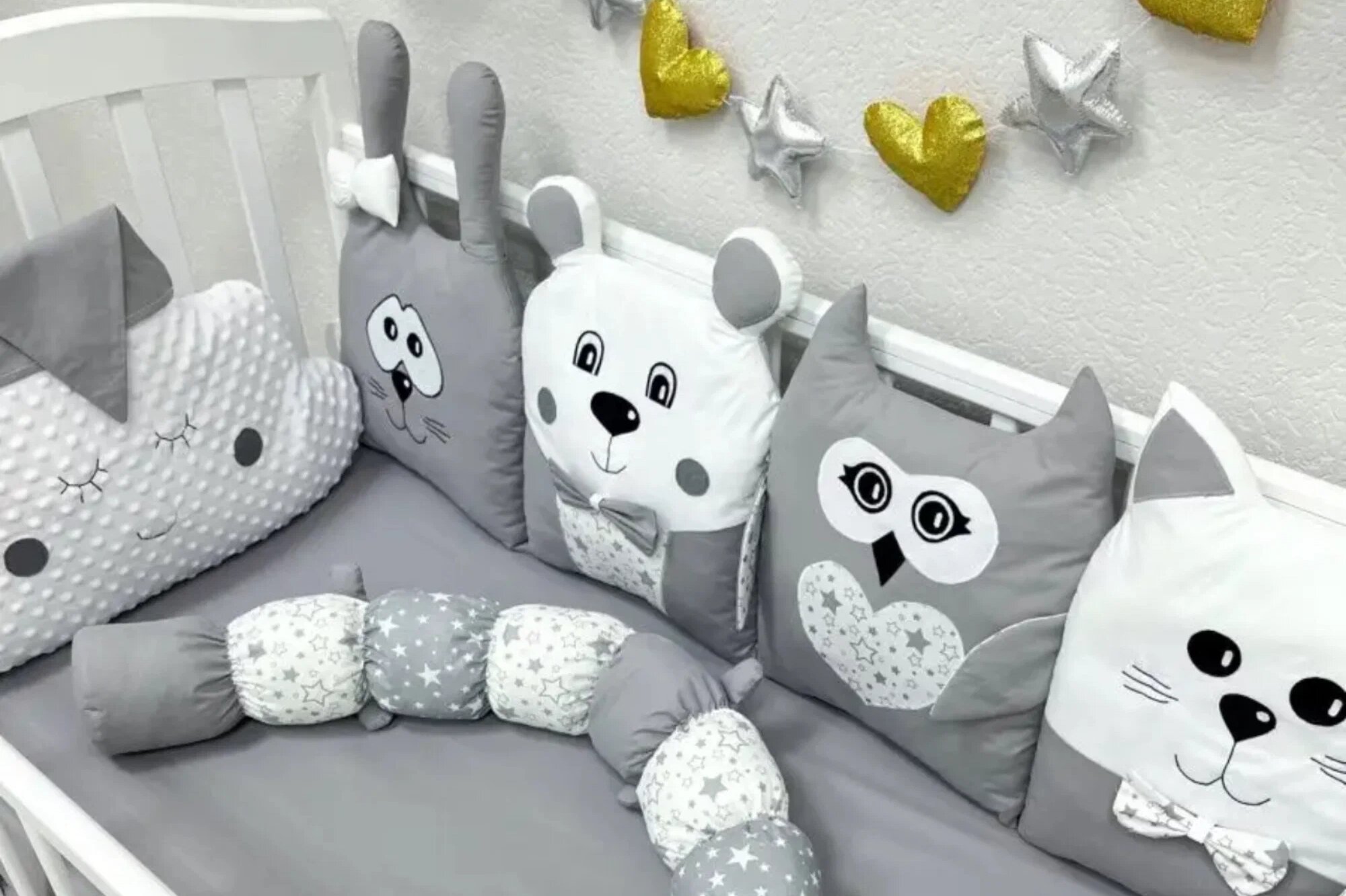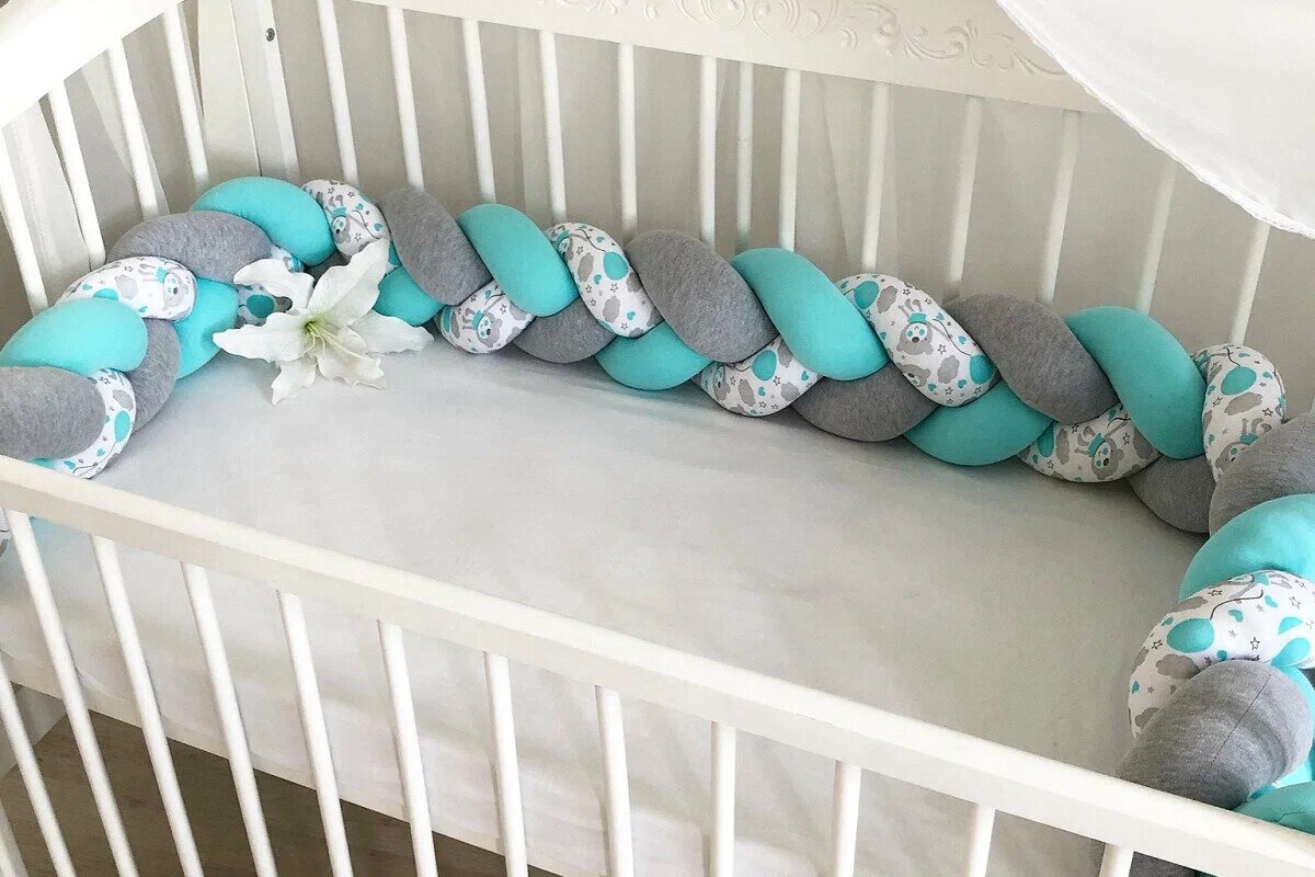 Бортики, они же бамперы, служат для защиты малыша от ударов о перила кровати и просовывания ручек и ножек между прутьями, а также оберегают ребёнка от сквозняков. Это элемент безопасности, но не всем он нравится. Считается, что бортики препятствуют циркуляции воздуха и накапливают пыль.