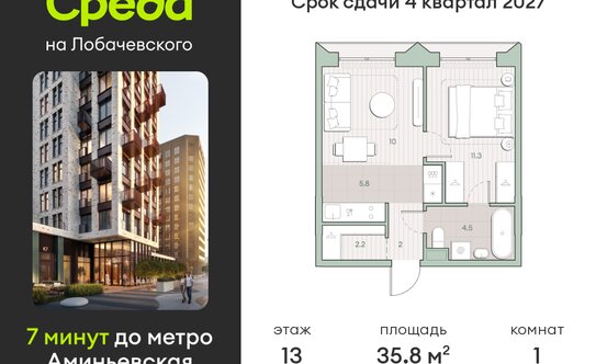 - 22,32 млн ₽Москва, микрорайон Очаково, ЖК Среда на Лобачевского, к5.7Очаково 16 мин.