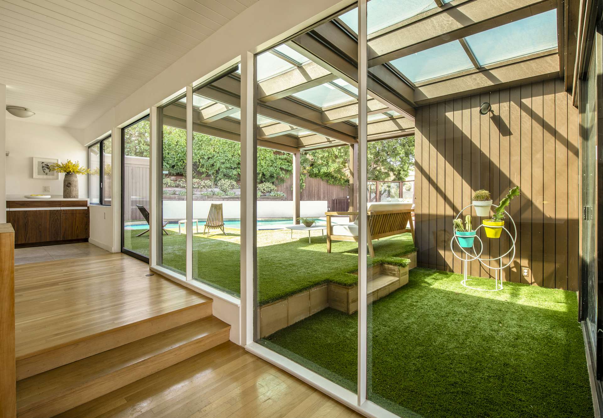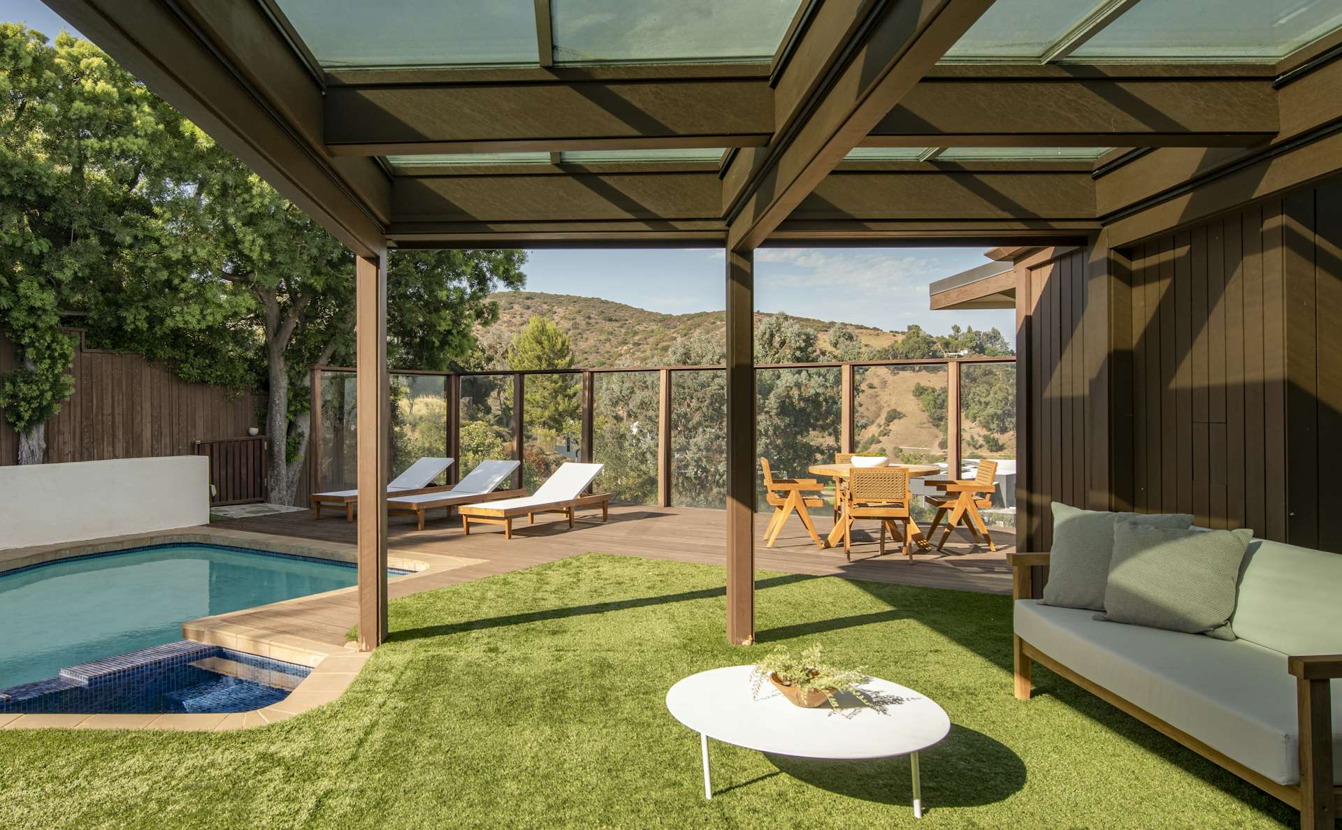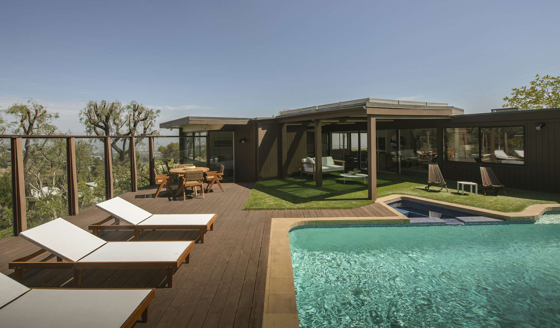 Стеклянные экраны вокруг террасы смягчают солнечный жар и защищают от ветра, позволяя обитателям дома в комфортных условиях загорать после плавания в бассейне и наслаждаться знойными пейзажами Лос-Анджелеса.