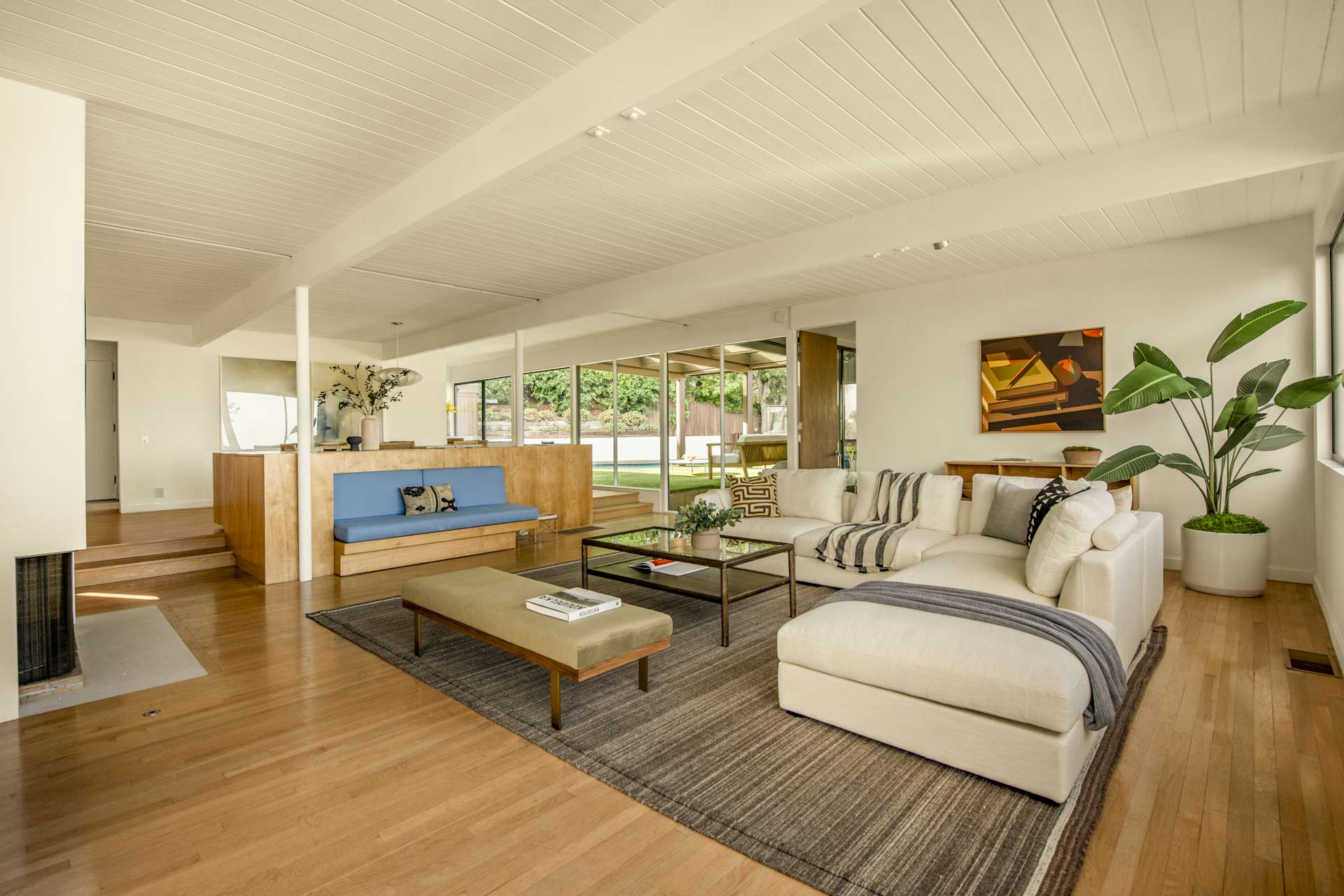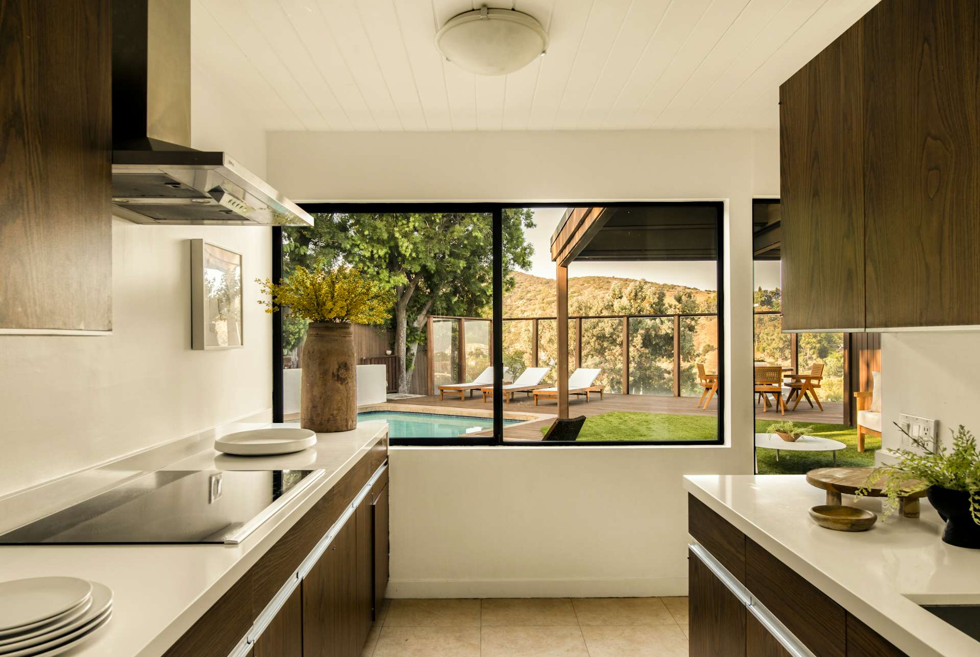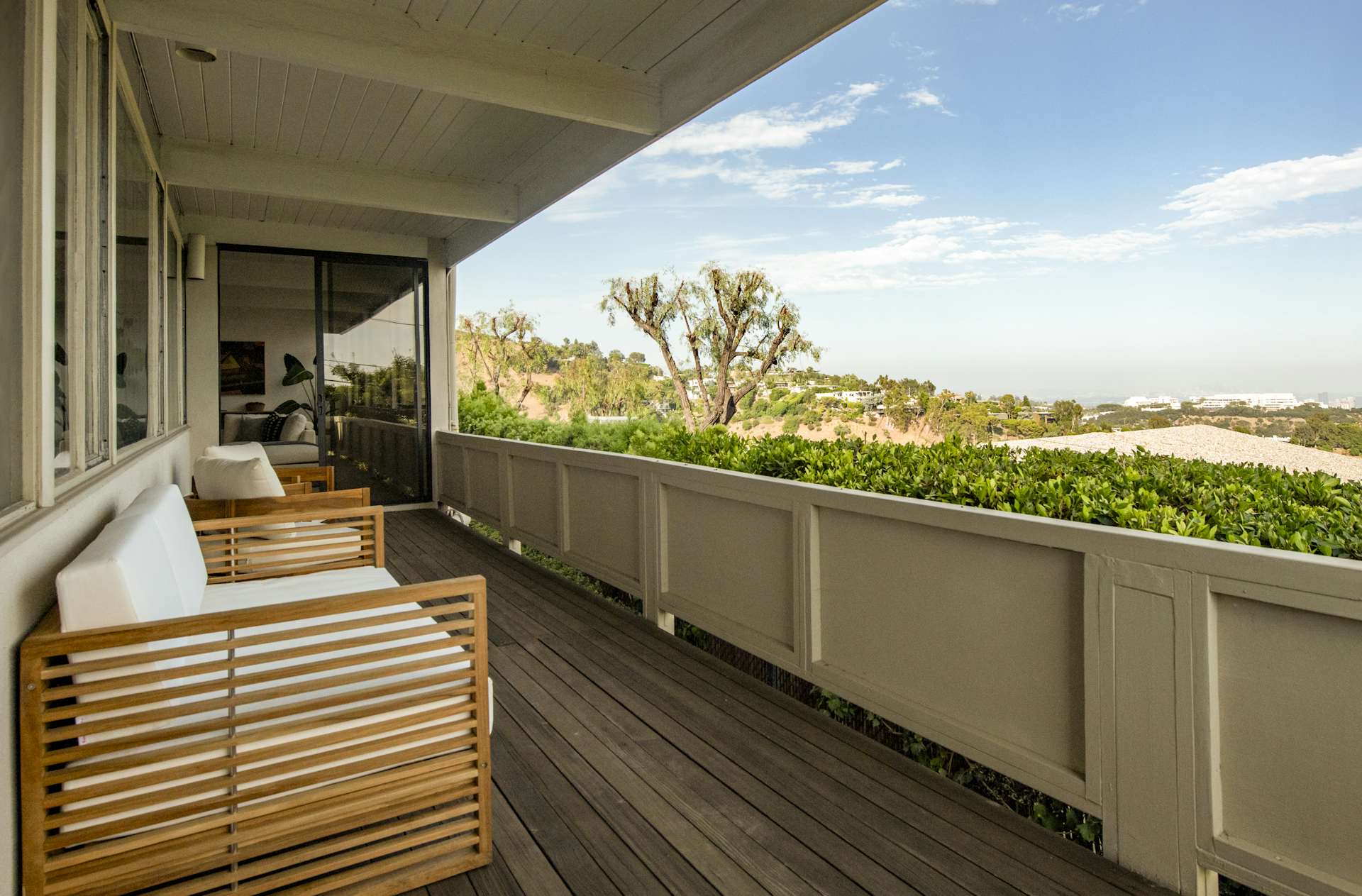 Стеклянные экраны вокруг террасы смягчают солнечный жар и защищают от ветра, позволяя обитателям дома в комфортных условиях загорать после плавания в бассейне и наслаждаться знойными пейзажами Лос-Анджелеса.