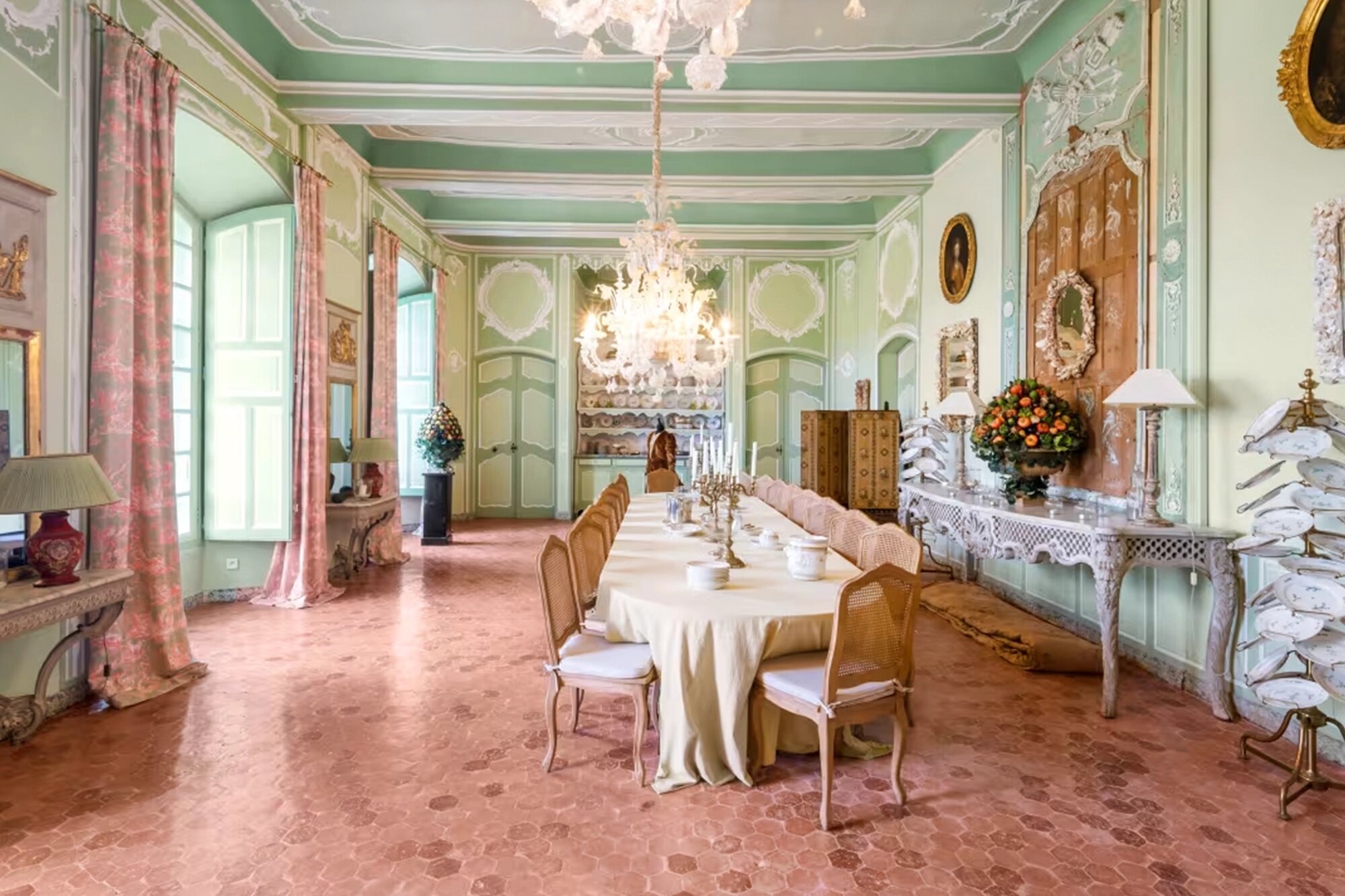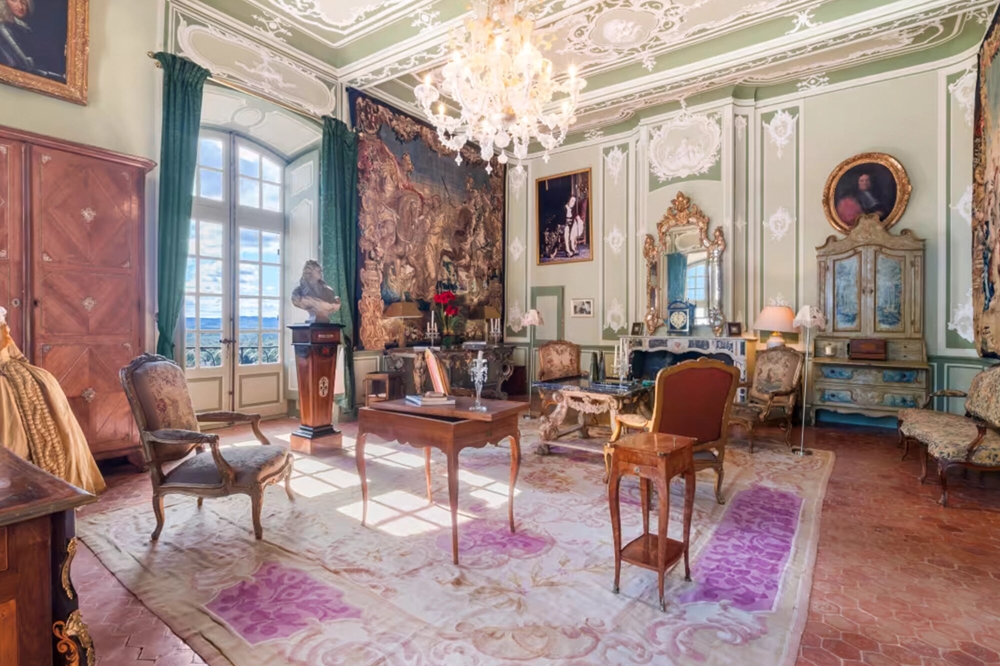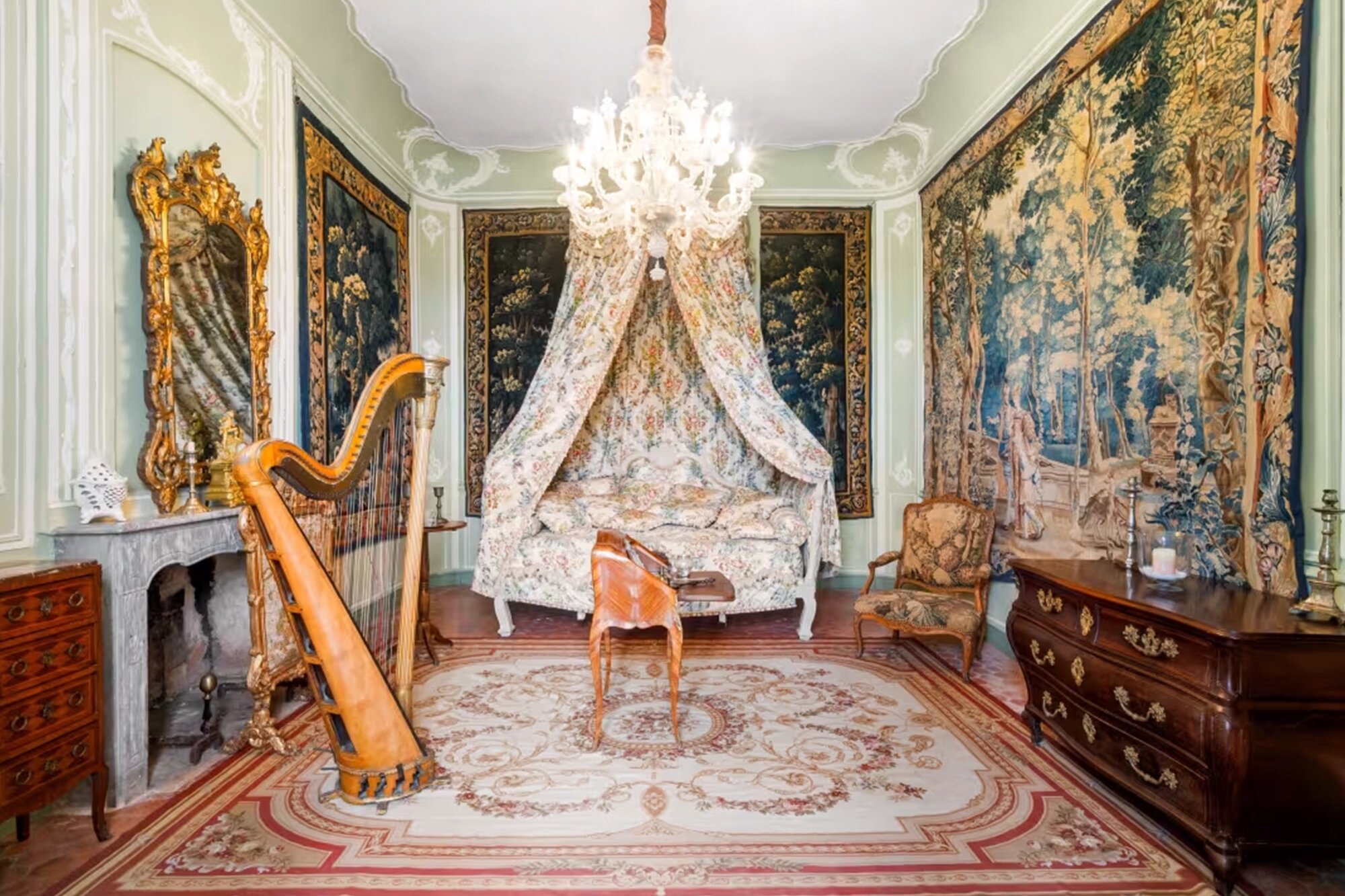 В этой огромной частной резиденции площадью 5 тыс. кв. метров 25 спален (каждая со своей ванной комнатой), есть бальный зал длиной 30 метров, терраса длиной 40 метров, 22 гостиных, большая столовая, две кухни, библиотека и архив. Последний владелец потратил годы на реставрацию, работы включали в себя ремонт крыши, окон и сохранение исторической деревянной и каменной отделки.