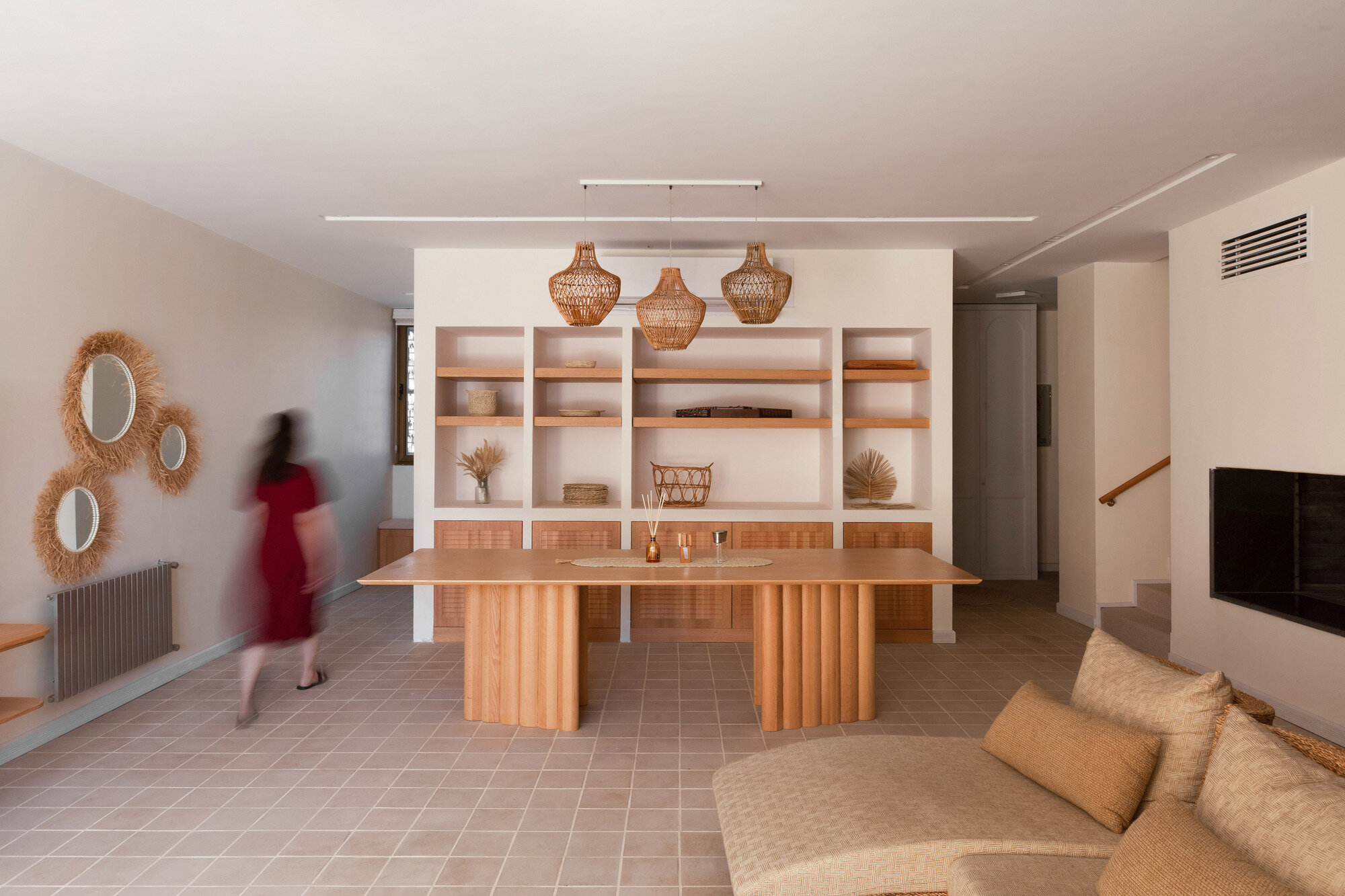 Ставни на окнах дарят дому тень и приватность, продолжая пропускать свет, и обеспечивают жильё вентиляцией. Спокойный интерьер в светлых тонах создаёт атмосферу уюта, совмещающую современные тренды с восточными узорами и плетёной мебелью.