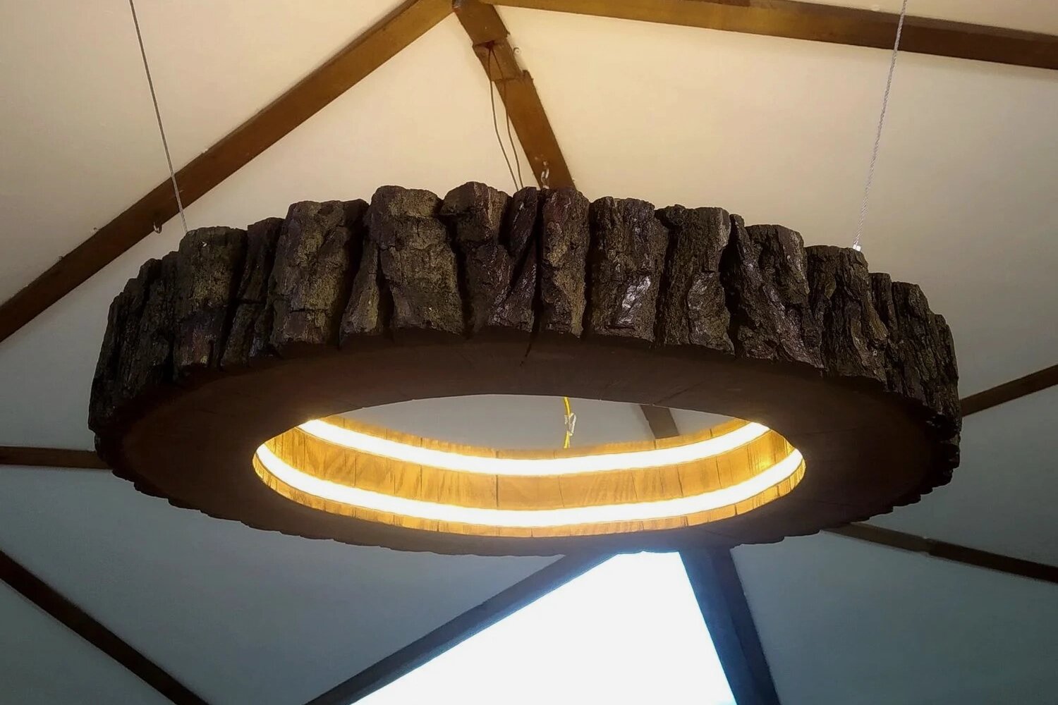 Например, в студии Mascraft придумали потолочный светодиодный светильник из кольца дуба и модель из деревянных реек, которые пересекаются и напоминают нашу галактику. Все люстры ручной работы. При заказе можно выбрать породу дерева, цвет, размер, степень окраски — если сделать её неоднородной, то визуально сохранится текстура дерева.